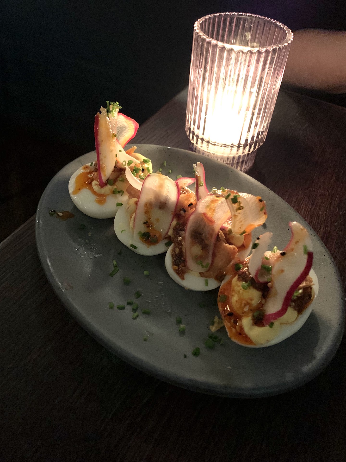 Read moreBooked reservation online. No mention of time limit. Got there, sat down, thought our waitress Jennifer was really pleasant and friendly. We ordered bread & butter, got three large warm slices and a nice tasty hunk of butter. We also ordered the deviled eggs and the prosciutto tarte flambé. Everything comes in three, a little awkward considering more often than not people go in pairs, but they offered to add one extra egg for a premium. The eggs were supposed to have candied chicken brittle, but I couldn’t taste it. In my opinion, there was just too much going on with those eggs and you couldn’t really pull any particular flavor out of the mess other than deviled eggs, and something spicy on top, although I have to admit, the presentation was lovely. Drinks were well-made. The tart, however, wasn’t warm enough when it came out, and it seemed way too greasy and fatty to be anything other than difficult to eat. The worst part, after ordering a second round, just a few minutes later, the waitress comes out and tells us that the table is reserved for the next party and they’ve been waiting for five minutes. This was extremely unprofessional in my opinion seeing as how I was expected to pay an extra $21 for a drink that I was now going to have to chug. Unacceptable. When you seat a party at a table, you immediately let them know of any time restrictions, additionally, before they order their next drink, you let them know they are expected to leave in a certain timeframe. This information was not conveyed in a timely nor professional fashion and I truly feel like I was scammed into spending more money without being able to enjoy. Not sure I’ll be going back anytime soon, not really recommending it to anyone, unless you’re just going for a quick drink at the bar. It was also super loud in there - we were screaming...