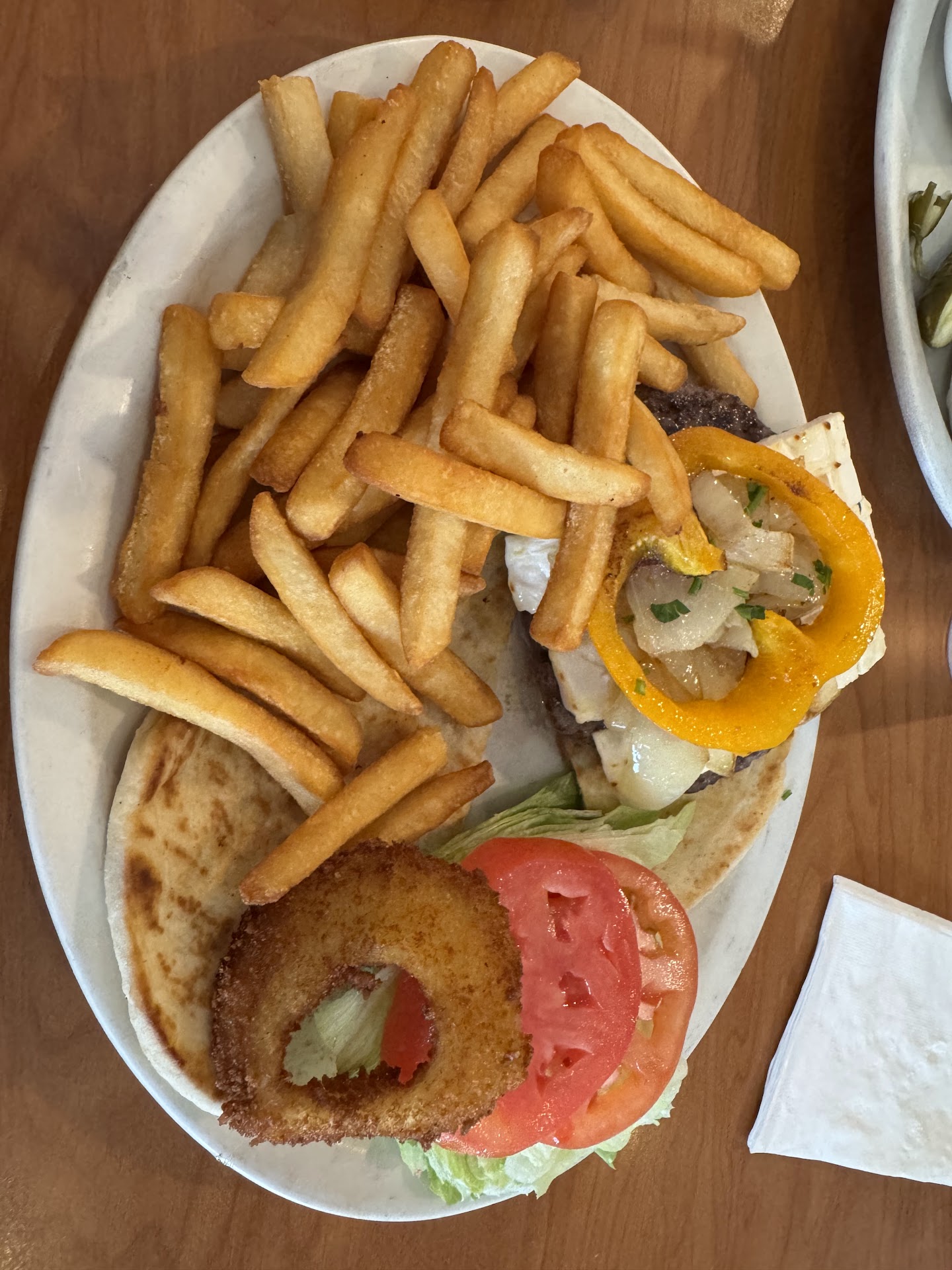 Two tomato slices sat there like crime scene evidenceâpale, rubbery, and dead on arrival. The onions were fried to death and still somehow oily, like the ghost of a deep fryer was haunting my plate. The patty? It was a prefab hockey puck, perfectly round, utterly flavorless, probably shipped in on a Tuesday. You couldnât taste the beef because it had already given up. I managed three bites before mercy kicked in.