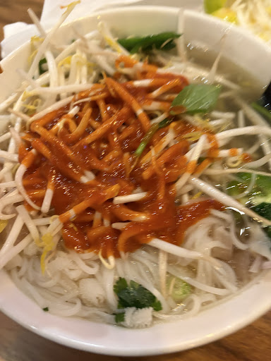 I got my usual, the pho with tendon and meat . The broth was very flavorful and tasty and it was still hot when served . Less than 5 minutes 3 bowls were served to my table to my friends I dined in with. The staff is friendly and didn’t seem to have a bad attitude which was good. The vibe overall in this place this aesthetic with dim lights , the interior is pretty also, with the restaurant quite busy it is still easy to hear others speaking at your table even when music is playing. Before my pho was served, they handed us a plate with lots of mint, beansprout ,4 pieces of lime, and jalapeño. The pho was about $14 but the portion of it seemed reasonable.I didn’t order any thing else on the menu as I was just craving pho and I was deeply satisfied on how it tasted like. Though I’ve tried many pho places as a Vietnamese person, this pho is a 10/10 and I’ll look forward to coming back and ordering different things...