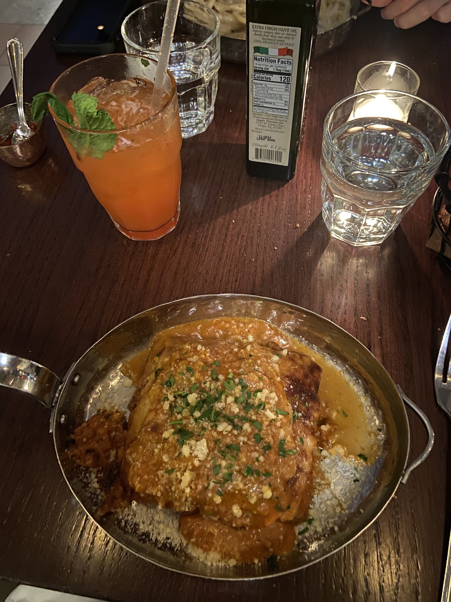 Read moreincredible spot. me and my boyfriend had a reservation for 6:30 but ended up coming a little earlier and were sat immediately. as you walk in you're greeted by the incredible pasta prep station where they handmake their pastas in front of you. i ordered a mocktail to start off with and it was beautifully made, i have no doubt their actual cocktails are just as amazing. i got the lasagna ragu and my boyfriend got the cacio e pepe. while we were waiting for our entrees a server gave us some nice flatbread with a side of olive oil and tomato concoction that i couldn't get enough of. the food came out so quick we didn't even have time to finish the bread. the bucatini is presented in a huge cheese wheel where they mix the pasta in in front of you. we ended with a 7 layer cake that looked kinda like a cannoli. the service was quick and attentive and although we didn't catch anyone's names, all the servers were working together and each made sure to check on us throughout the meal. and oh my god what they managed to make of the tiny space they have is incredible!! i was in awe of how small the place was but how well everything fit together. i was stunned to find out they have multiple locations, this really feels like a local hole in the wall type of place. they've got italian art all around the place, even in the restroom, which was honestly really engaging for us to look at as we were waiting. we even got to help sing happy birthday for a nearby table and clap along to a traditional italian song. felt like i was in europe again haha. presentation really is everything to them and...