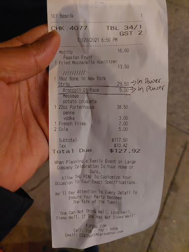 Ā Ā Ā Read moreI had to change my review to one star after what happened to me here. It used to be my go to restaurant but apparently they steal from people. Please bear with me. Here's a picture of the NY strip I ordered and broccoli di rapa. The steak was amazing but the broccoli was bitter since it had burnt garlic. I asked the waiter to change it because it was inedible but he said NO because I already ordered it. Not even ihop is this stingy but whatever I left the whole thing on my plate. My biggest problem was when it came to paying. Here's a picture of my receipt which was 127 dollars. I had taken the picture because my friend had an issue with not being able to split the payment, which they don't do at this restaurant, so I ended up paying the full balance with my card and then taking a Pic to later send to my friend so he could send me his part of the bill. THEY CHARGED ME 147 DOLLARS. I believe it was the waiter who did this on purpose because we went ourselves to pay at the register since he would come and go after assisting us for 10 seconds, not paying attention to us. This was a busy Saturday night. On Monday I called the place and the manager said "This has been happening to a lot of ppl, if you don't see your money in your card by the next 2 days come back and we'll return your money". I didn't see my money so I went in on Wednesday and spoke with another manager and showed him the picture of the receipt. He said he would fix it and to give it 24-48 hours. Today is Friday and there's nothing yet on my card. This is outrageous and worst thing is that they're getting away with it. Who knows to how many people this has happened to. Please BEWARE and pay cash. Oh and don't go when busy or waiters will do this to you and managers will literally do nothing. What a disappointment, I'm not...