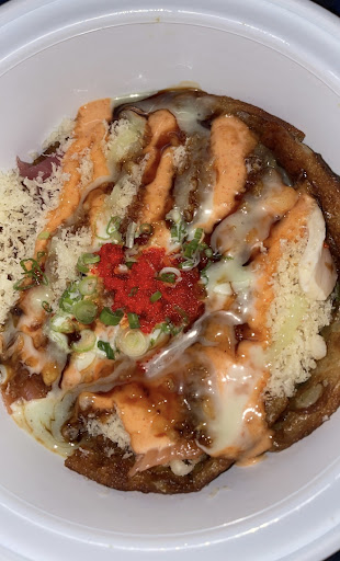 The Bird Nest Roll was made up of fried salmon, scallions and cream cheese, topped with kani, tobiko, mayonnaise and panko crumbs, toasted and drizzled with sweet chili, eel sauce and wasabi mayo. Now thatâs a mouthful of ingredients. This roll was appropriately named because it literally did look like a birdâs nest, complete with brown accents around the outer rim of the plate to mimic dirt.