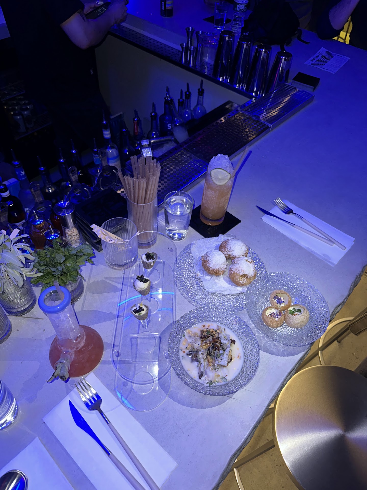 From the moment we walked in, it felt like we had stepped into a futuristic dream meets avant-garde art gallery. Every corner was buzzing with creativityâfrom whispering marble busts to glowing payphones and playful cocktails served in the most imaginative ways. The Reverse Space Time drink? Out of this world. And the blue crab donuts? Absolute magic.