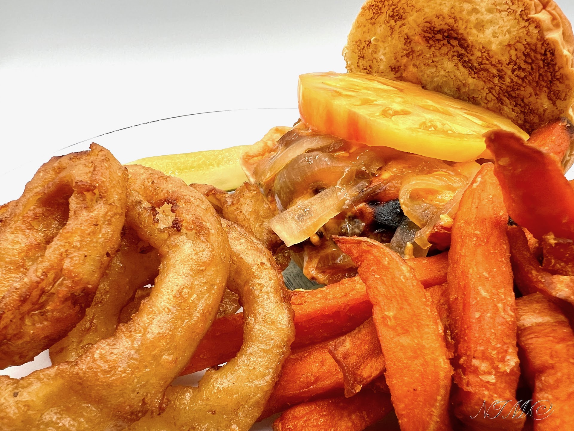 Two hamburgers: one with cheddar cheese and sautéed onions with fries, and the other blue cheese with sweet potato fries and a side of onion rings. Both fries and onion rings were poorly cooked. The oil temperature seemed inadequate to provide the desired crispy texture to the fries and onion rings; instead, they turned out greasy and practically inedible. The burger had a funny taste and the blue cheese looked like a glob slapped on as well, maybe fried in seed oil (known for being unhealthy and challenging to digest), added to the overall disappointment of the meal. In conclusion, my dining experience left me feeling disheartened and underwhelmed. Based on this encounter, I cannot claim to be a fan of this establishment and have reservations about returning...