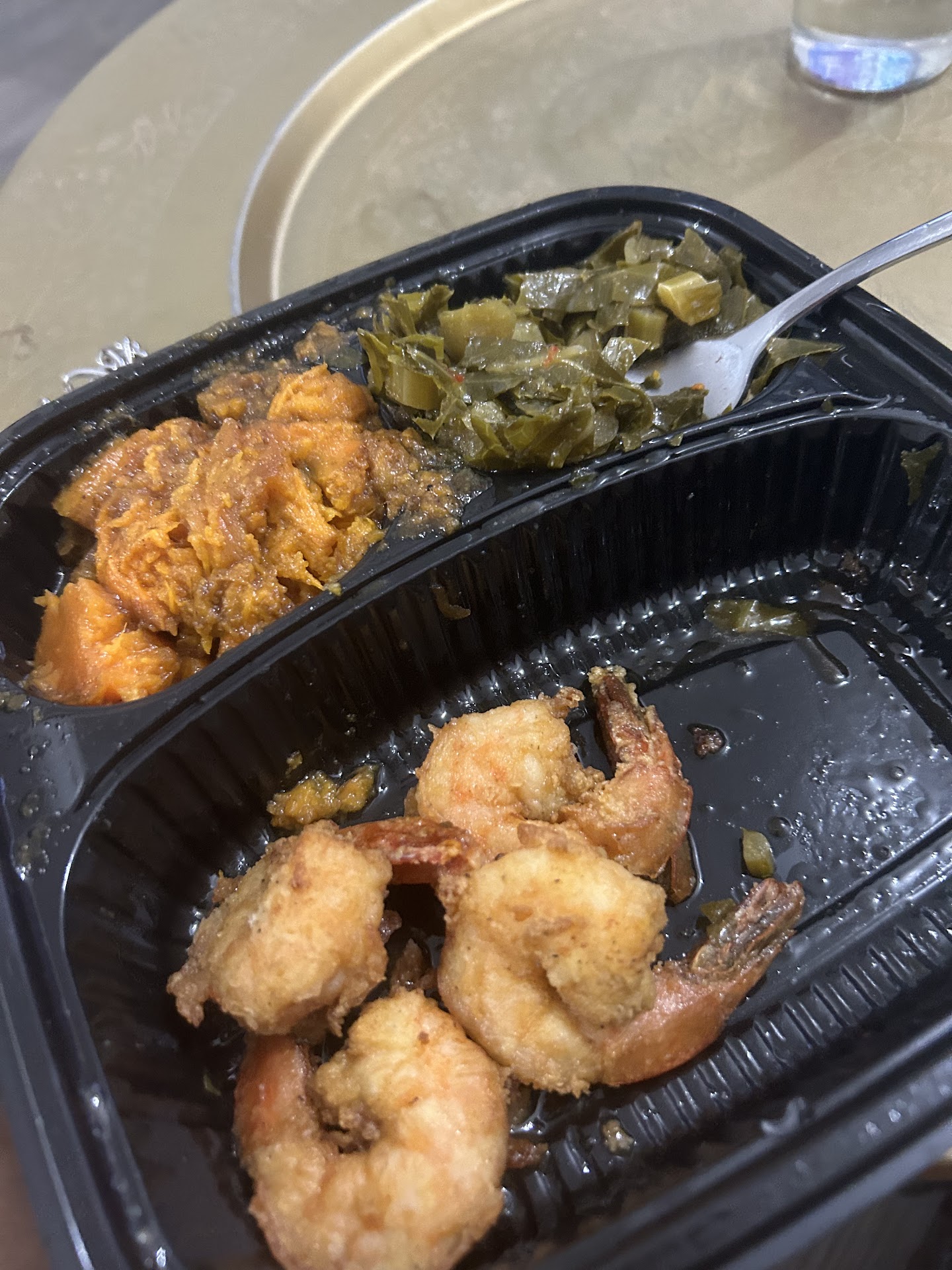My coworker picked me up a to go dinner with, what was supposed to be collard greens, mac n cheese and BBQ wings. She must've asked for the burnt special. The wings were heavily drowned in bbq sauce to hide the fact that those wings were over 5 days old and burnt smh.... Everything about the meal was disgusting. People work to hard to bethrowing their money away on messed up food.I know not to purchase anything else from there. That was a one and...