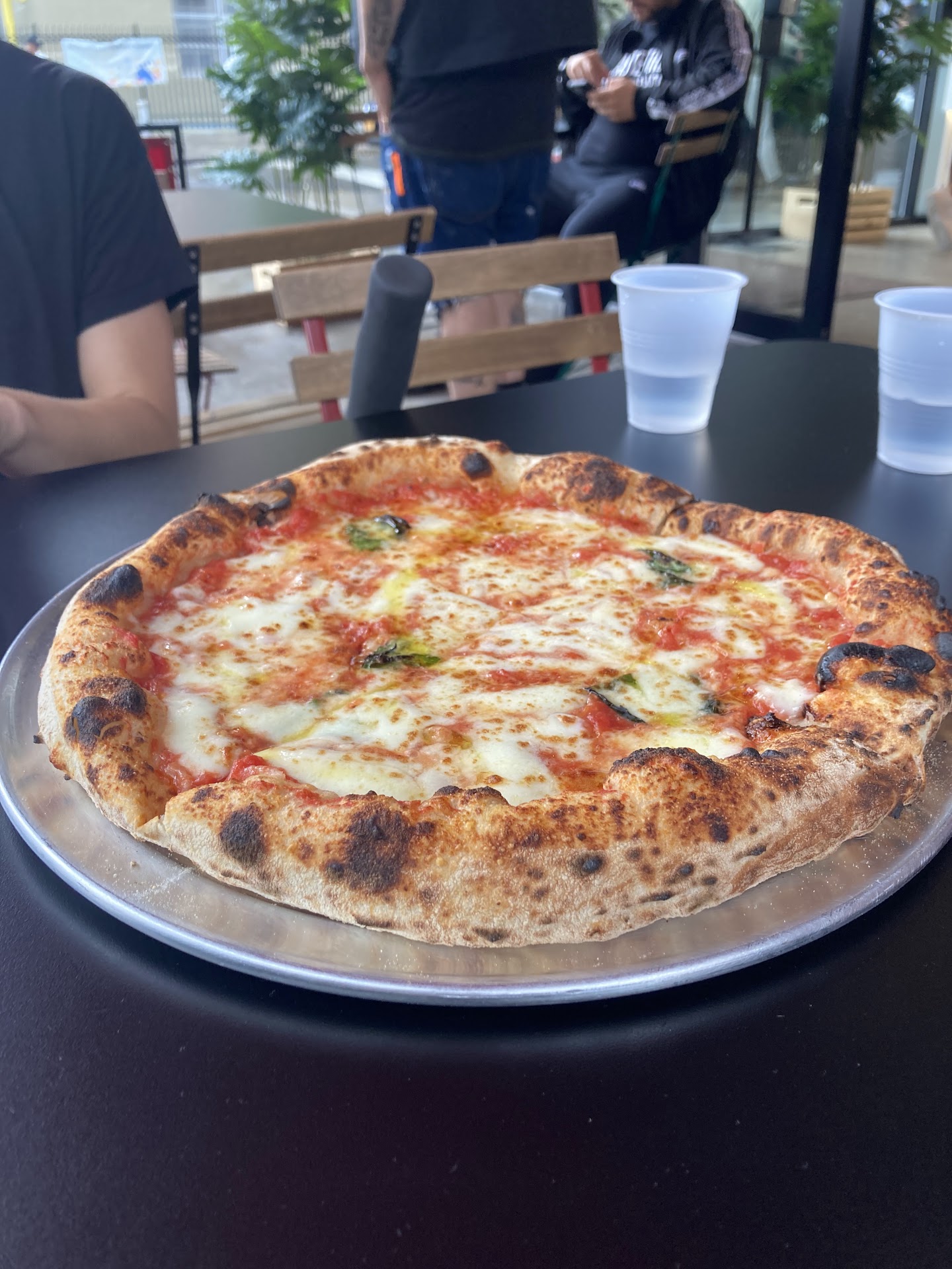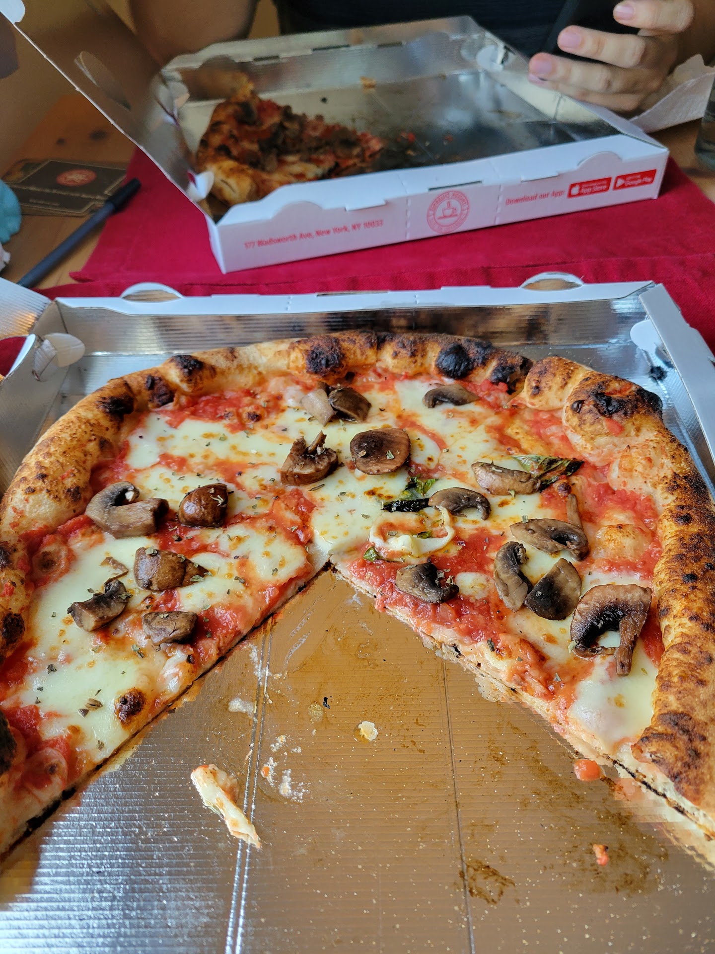 As a local in this area, there are only a few places I would highly recommend for pizza in this area and this is definitely one of them! The pizza here is super fluffy and has flavor throughout the crust and I normally don't like to eat the crust. The sauce was light, fresh, and sweet; the tomatoes were just amazing in the margarita pizza! I am all about plain cheese pizza so I would recommend getting the margarita pizza here I found it to have a good amount of cheese and sauce which I love. For me, you can never have enough cheese! I had the red velvet cake slice here which is honestly the best red velvet hands down I ever tried in the city and I have had some top-rated places, the icing was cream cheese and it was amazing! I am super excited to have this in our neighborhood in Washington Heights and if you are not in the mood for pizza but your partner is you can always grab cheeseburgers and hot dogs next door at Burger heights and eat together in the outside seating! I give this place 5 stars and highly recommend it; the only thing I have not yet tried is the lattes here but I will the next...