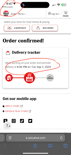 Read moreI have been ordering from here about once a month for the last 2 years without any issues. I placed an order on the Pizza Hut mobile app around 7:30 tonight (as I always do) and noticed it took longer than usual to get the text alert for delivery. When I checked the app (which is usually accurate) it said my order would be delivered around 8:06pm. At 8:30 I contacted the store because I noticed the order said it was still being prepared. The male employee i spoke to said they had the order ready, but it was awaiting a dasher to pick it up and it would be on its was “in a few”. I told him it was strange because it never takes this long. He said the order can take an hour or TWO to arrive. I thought this sounded ridiculous, but i just told him okay. Around 9:20 I contacted the restaurant to inquire again and the employee said it’s waiting for pick up and I would have to wait another 10 minutes before the order is picked up. At this point I had to tell them it’s been about 2 hours since I placed the order and he repeated “2 hours since you placed the order” sarcastically. When I asked how can I cancel the order he said “I don’t know, go on the app”. After 2 hours of waiting for food I had to go on the app to find an agent to chat with in order to get a refund. They took the store info and said they would escalate it to corporate. I hope they do! I attached one of the screens shots of my order showing the estimated delivery time along with the time on the top left of my phone. It’s now 10:50 and my order still says...
