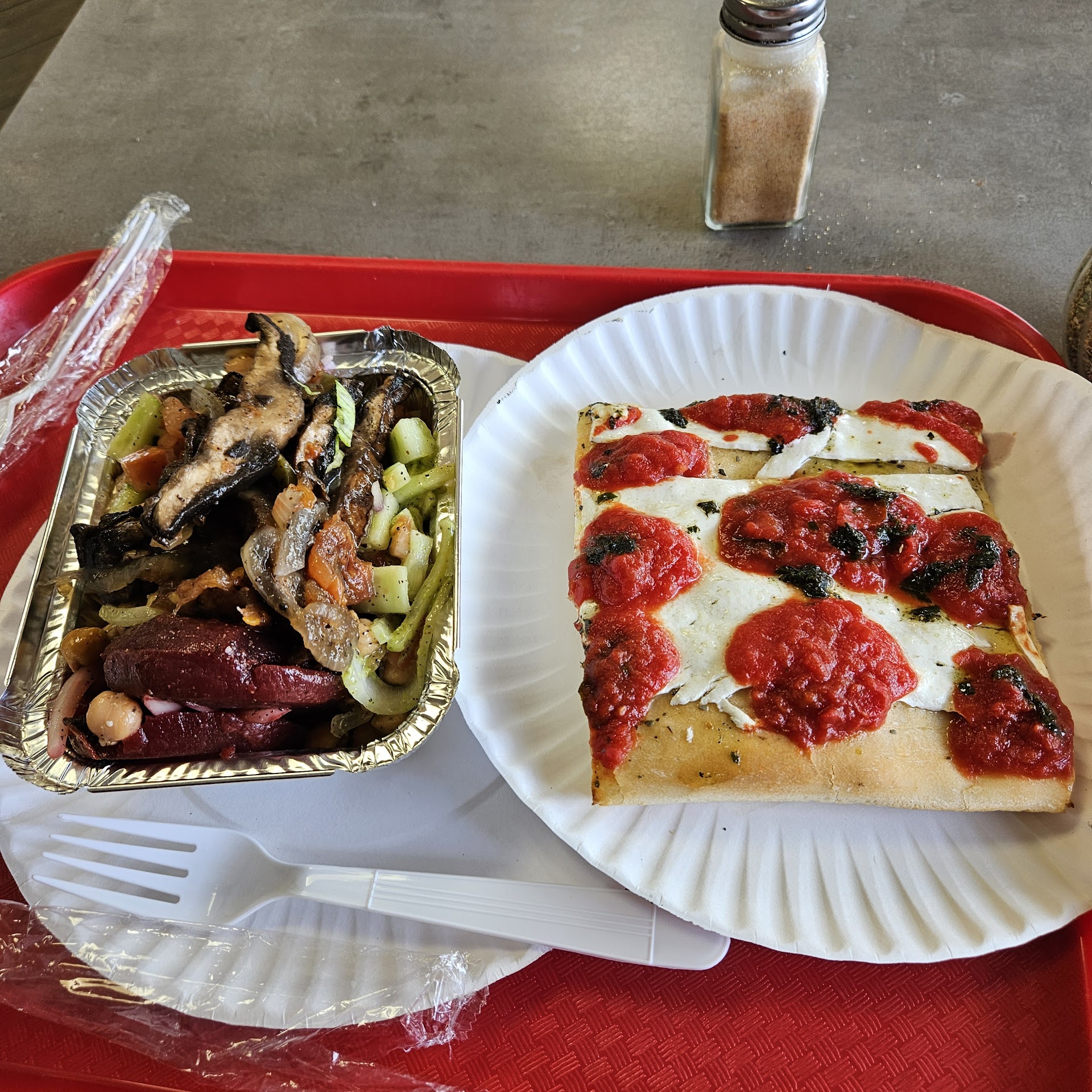 Food review: My kids enjoyed pouring their own slushies. (Red and blue flavor) I ordered a spinach calzone to go. They cut it in half and threw it in the oven to heat up. By the time I was done filling up the slushies, my food was ready. The spinach calzone needed salt. There did not appear to be ricotta inside - just spinach and cheese.