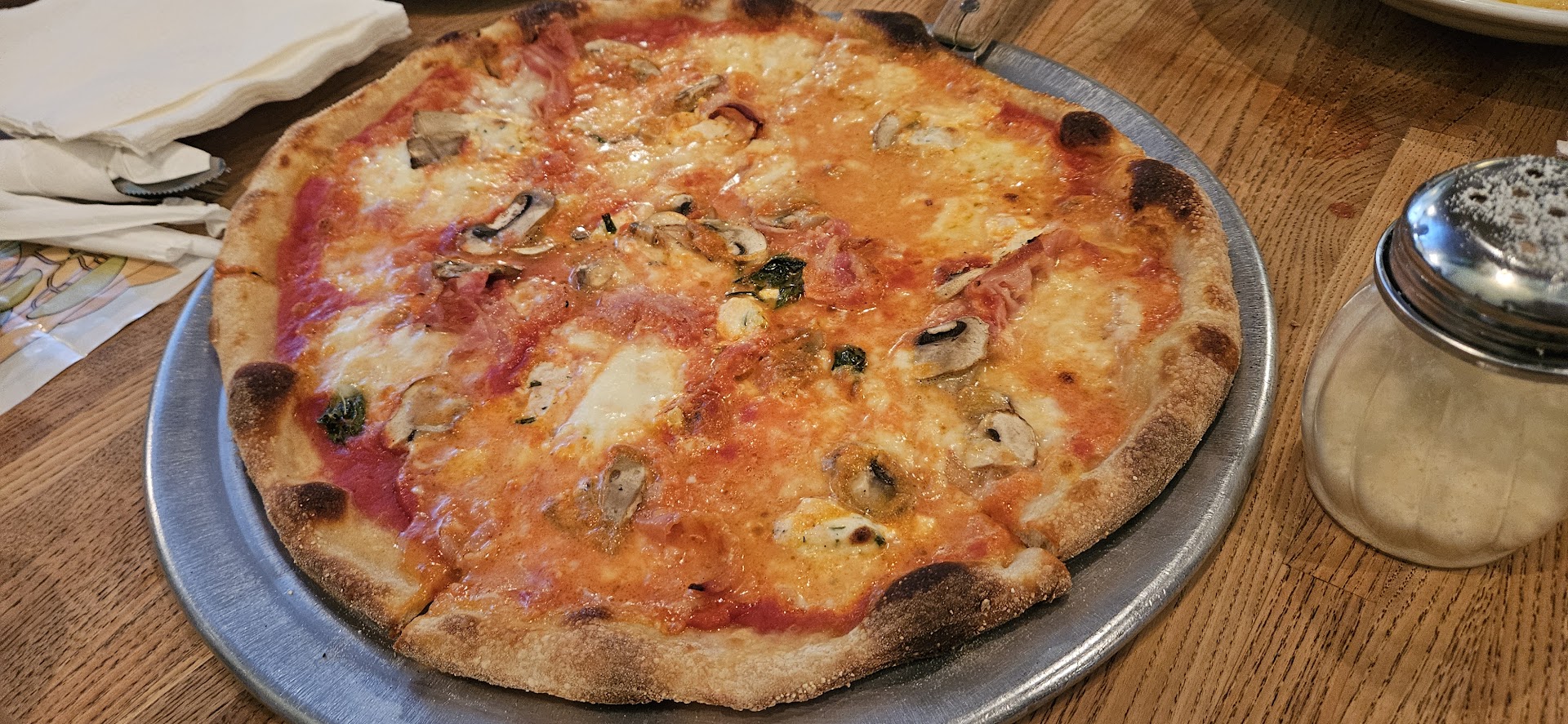 Pizzeria Giove is the best wood burning pizza on the Island. I love their story as told on their menu, even though they spelled Pizzaiolo wrong ... We went on quiet Sunday during 4th of July weekend and we were the only people in the restaurant. We ordered a caesar salad and fried calamari to start. The apps came out quickly. The caesar was good, though I prefer shaved parmiggiano on mine. The calamari was underseasoned and came with the tiniest shot glass of sauce, which wasn't enough for half of the platter. It was a good amount of calamari. Now onto the main event, first off the menu is broken down into 2 pricing categories: small and large. The small 14" pizzas (6 slices) run around $15 and the large 18" pizzas (8 slices) run around $32 and up... Unfortunately, they don't allow you do do half and half pizzas, which forces you to order 2 small pies. The pizza took forever to come out. We were the only ones in the restaurant and if you are making true wood burning or coal burning oven pizza, they shouldn't take more than 2 minutes to cook. The margherita was just okay. The pizza texture is extremely thin and crispy, which I like, but I prefer some small air pockets on thin pizza, yielding a nice chew. The specialty pizza we ordered was called the Gustoso, which had straciatella, hot sopressata and sweet sausage. It was excellent, like hard to stop eating even though we were so full. Stracciatella is mozzarella stored in heavy cream so it's like you are eating cream sauce on your pizza, which is really tasty. If you are stopping on for the first time, try the small...