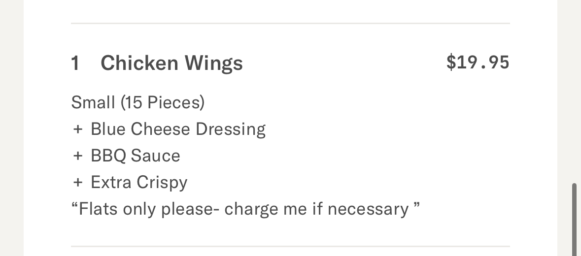 I even have noted that they can charge me for any substitutions as most place charge for these types of things or will not do them at all. So this isn’t about the money. The point is I work hard for my money so if I use it for a service that isn’t done correctly then the establishment should do something to rectify it. The app slice claims you’re denying any participation in finding a solution. To anyone seeing this use Uber eats because at least their help line can do something other than apologize too many times. As far as the restaurant the wings aren’t all that, you just get a good amount for the price they charge. But if you’re like me and understand how under cooked chicken can be sickening, you’d be just upset about me. And I’m not talking about medium cooked a rib eye steak here. Pink...