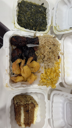 This time I had the jerk chicken with macaroni and cheese, shrimp, rice, and peas, trand sautรฉed spinach on the side and a carrot cake!