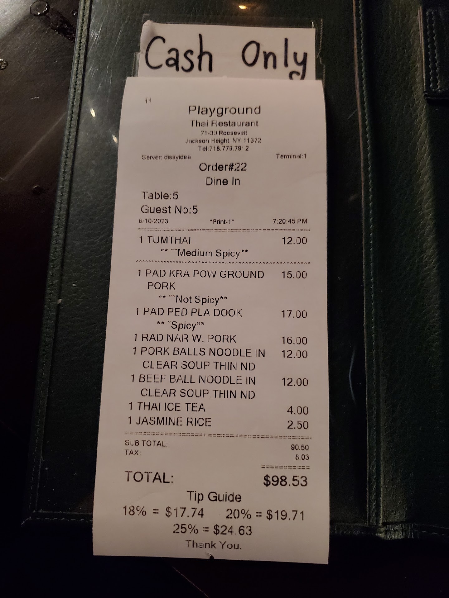 CASH ONLY!! I don't know if it was the random Thursday night we were out or if 5:30pm is the time for everyone in Jackson Heights to go to get cash, but it was a headache to get cash. Thus, my recommendation is to have cash BEFORE you come to Jackson Heights. There is a Bank of America ATM IN the station near the 74th Street exit and a Chase ATM on 75th Street outside the station. Both lines were long. I first stopped by to check out the wait time at 5:20, and it was pretty empty. I then went to grab cash. By the time my friend and I got cash, it was closer to 6pm, and we snagged the last table in the restaurant.