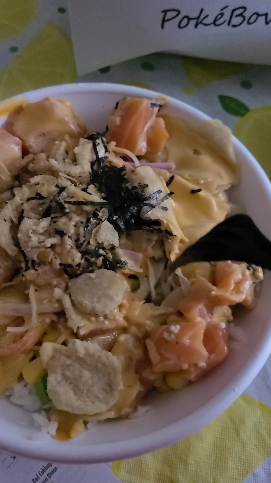 12/4 another to-go order, brown rice, salmon and tuna, fresh and good lots of toppings$1.50 extra for avocado. But $3.00 for large bubble tea when you buy a bowl! That's a good deal.