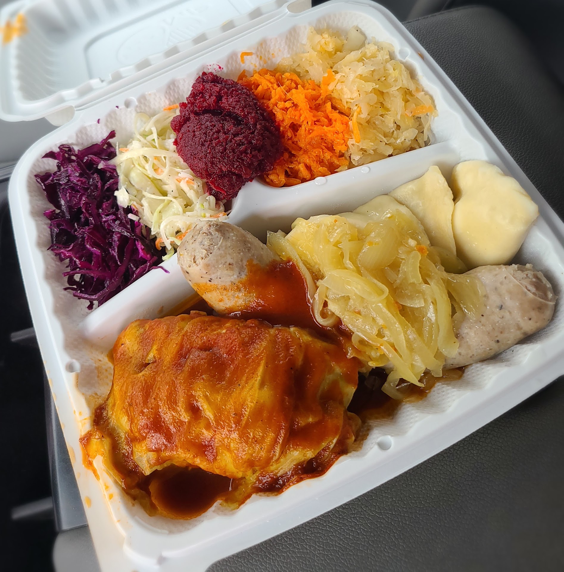 A few small gripes: First, they should mix up the salads a bit because it gets monotonous to eat the same (excellent) 5 salads (beet salad, coleslaw, sauerkraut, red cabbage, carrot salad) each time. It's cool the first 2 or 3 times, but by your 5th visit here it's tiring. Maybe they should only give 2 salads and change up which ones you get. The 2nd gripe: while you're eating, they use Fantastic to clean the table next to yours with no regard about where the spray goes. It never fails -- I always get Fantastic up my nose and it ruins dinner for a few minutes. The last gripe is that they don't accept credit cards; but I suspect this is because they don't need to -- the food is so good that they can be cash-only and still turn a healthy profit.