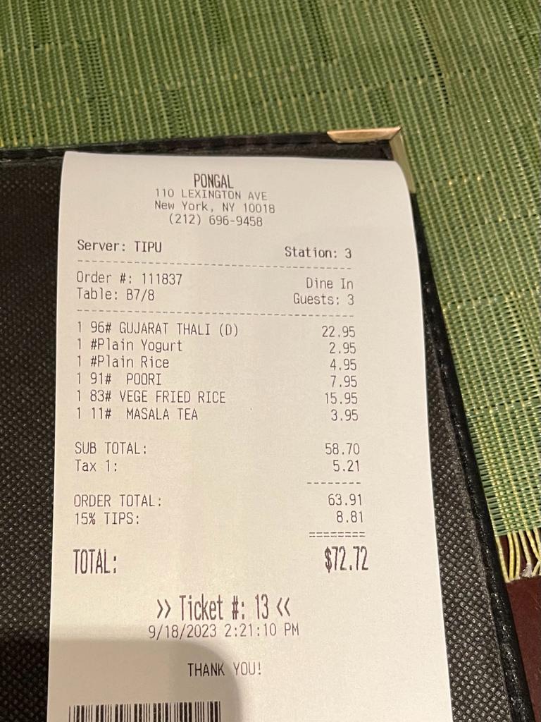 Must try THALI was a complete meal and a great way to sample a variety of Pongal’s offerings from flavorful sabzis and dal to roti, rice, and dessert.