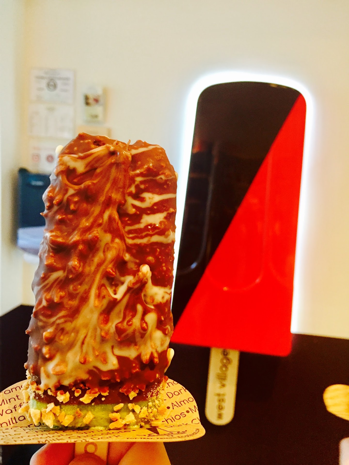 Long: Walking into this place you get a modern ice cream shop vibe. The ice pops are all aligned in the fridge in front of your eyes with all of the amazing flavors next to them. On the counter they have an assortment of toppings including chocolate and coconut to name a few.