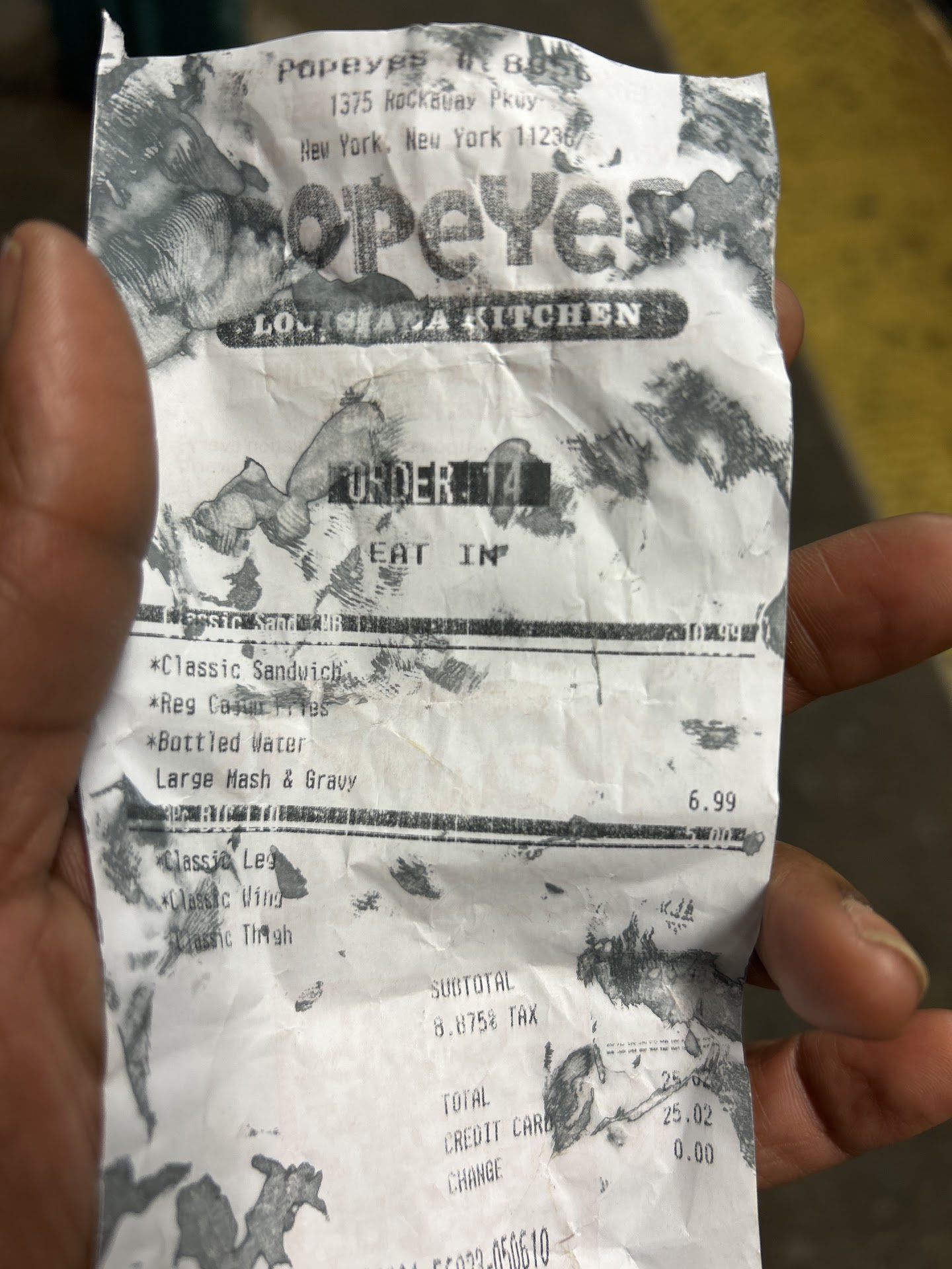 I was just at the restaurant at 1375 Rockaway parkway. 6:05pm my order was over $25, I asked for a brown bag to keep my food warm, the distance that I will be traveling. The lady at the register packed my food in the brown bag and as I walked off the bag ripped. I walked out then realize how nasty that is, I trashed the food before entering the MTA across the street. I called the restaurant to speak with a manager and was told no mangers are available the person can help me, as I explained they hung up the phone. I called back and was hung up on again. I will take my receipt to the restaurant tomorrow in hopes for a refund. This was bad service, and should not be accepted. I am a customer and spent my hard earned money. I demand better service. Take a good look at the receipt, the ink is is running but the address and price and...
