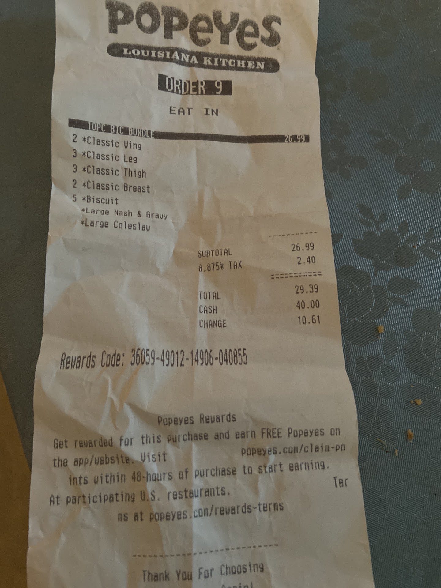 I was a regular customer of this Popeye for so many years in this neighborhood. Today 04/04/23 at around past 9pm, I bought a 12 piece meal and one popcorn shrimp (shrimp only). She quoted me a price for shrimp only @ $8. I said ok. My order number was 65. I gave the cashier $60. My change was $11.25.