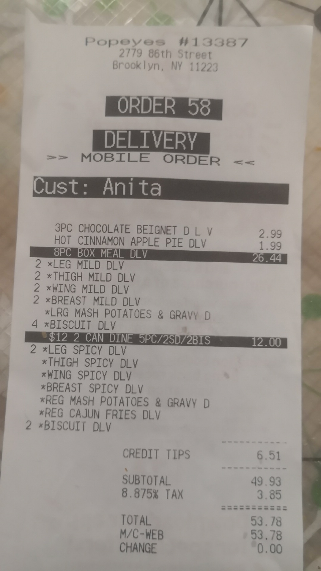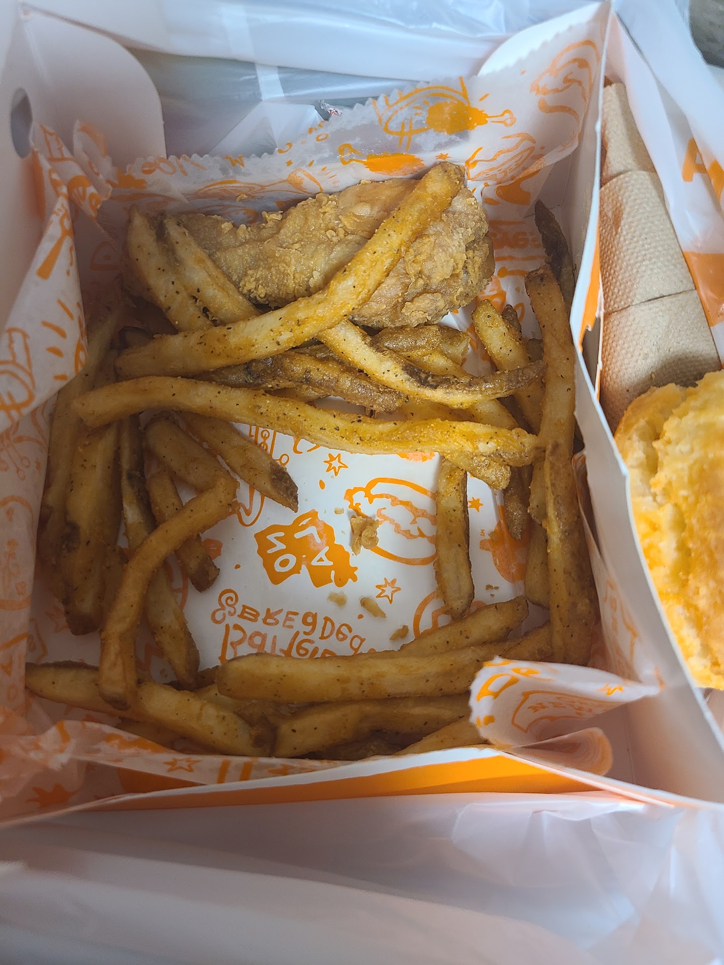 I did not get food here, but I worked as a Uber eat delivery person. 3days ago I picked up an order from this Popeyes location, I had a ebike I parked it outside the store. A woman(employee) around age 40-45 was touching my bike squeezing and grabbing every part of it as if she was trying to steal it. I walked outside confronted her, she acted like a Karen screaming at me it was blocking the store. Meanwhile it was just sitting on the right side of the door. Both doors could be open without a problem, because if a 6ft 150lb man can walk through without touching or moving the bike then I see no problem for a 4ft10 woman to walk through as well. And I heard she said “I own this store I can do whatever I want.” Not sure if it’s the manager there, I’d suggest choosing a different manager to represent your store. I Wouldn’t hire a...