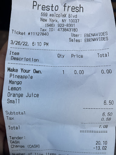 Overall, I highly recommend Presto Fresh Cafe to anyone seeking quality food in Harlem. Whether you're a foodie, a health enthusiast, or just looking for a great meal, this restaurant is a must-visit. Don't miss out on this culinary treasure - it's a true standout in the neighborhood's dining scene.