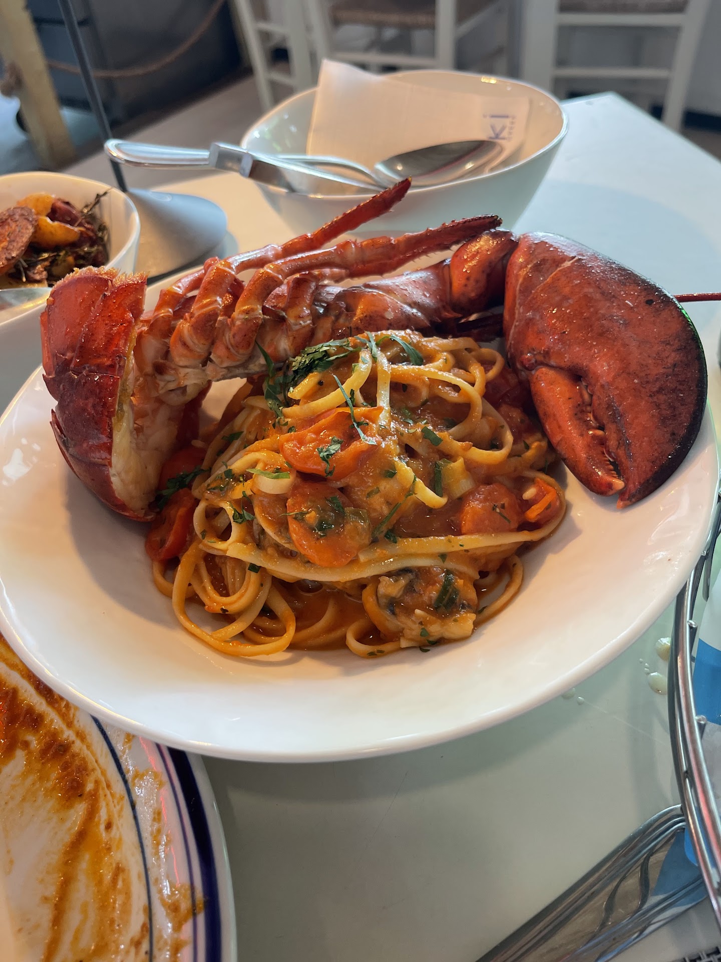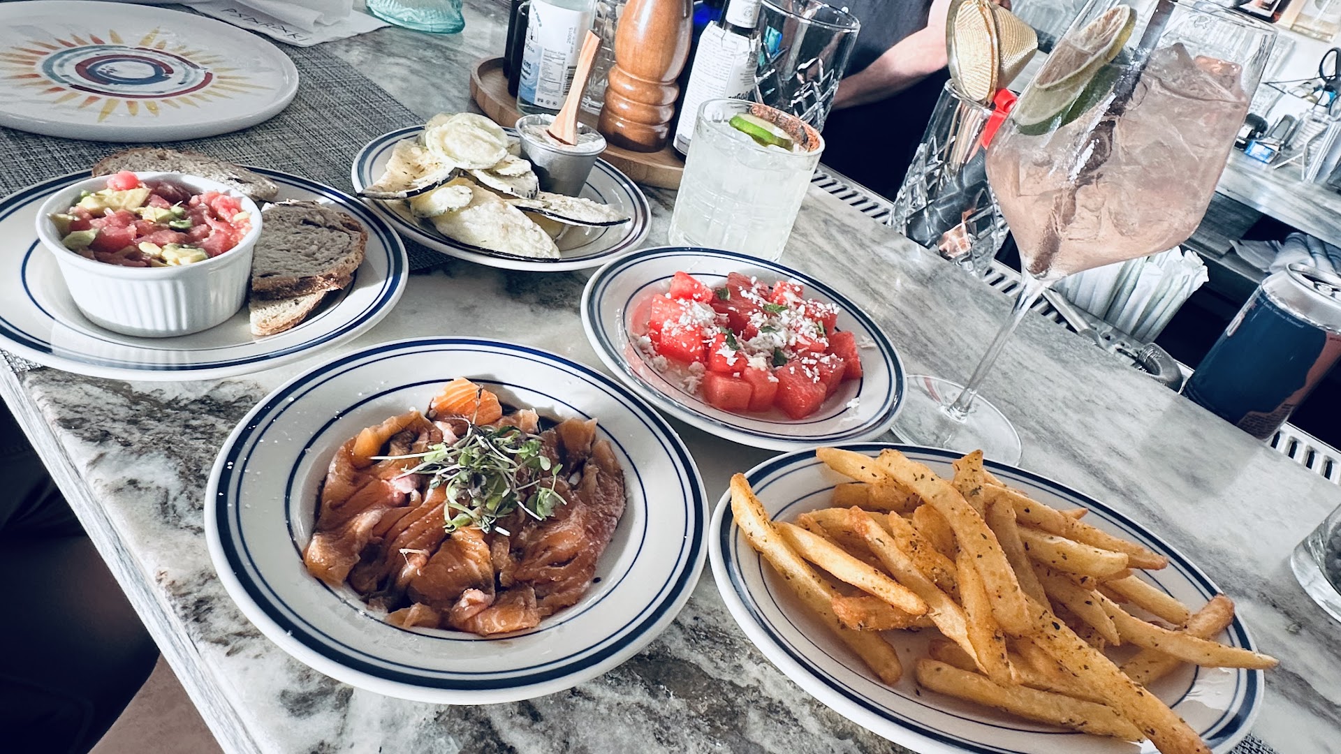 The watermelon salad they offered was refreshing. We then ordered almost everything off the sunset menu I to try, which included salmon sashimi, tuna tartare, truffle fries & veggie chips. To top it off we also ordered a lobster pasta. The food came out delicious, especially the truffle fries, which I couldn’t keep my hands off of. The lobster pasta was a good portion served 1/2 lobster whole and about 1/2 lobster mixed in the pasta. I had a psaraki spritz, as I didn’t know about the sunset menu when I ordered, but I won’t knock it because it was delicious and refreshing! My friend ordered a few of their “Have-a-Margarita”. Then we tried some mango-margarita shot and those were delicious!! To end the night we enjoyed a delicious traditional Greek dessert, bogusta!