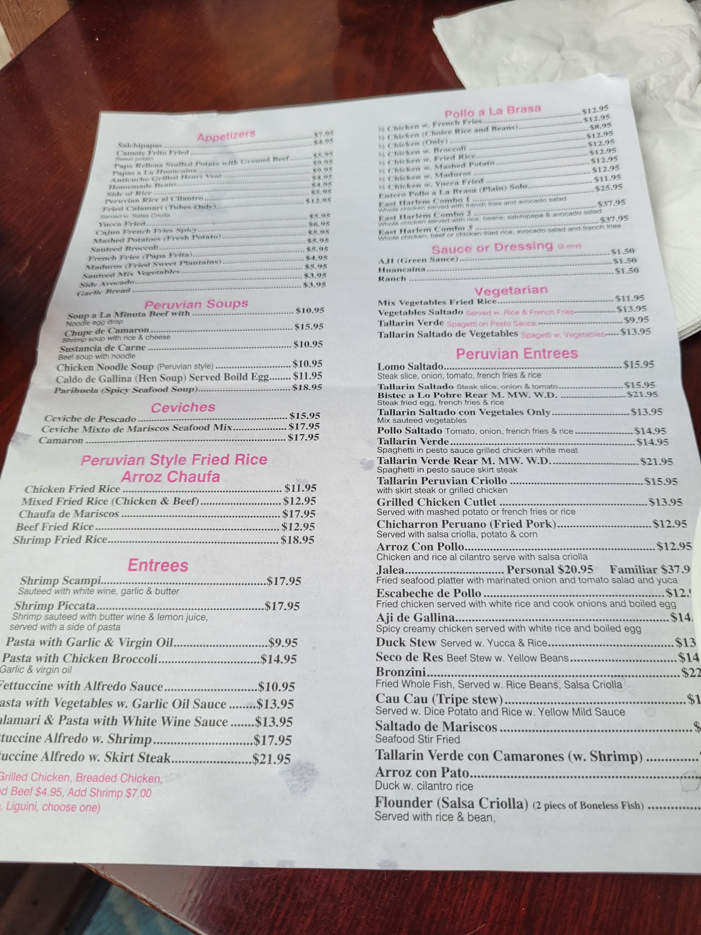 Very disappointing customer service. I have been going here for years and my order never strayed far from the pollo a la brass. However I decided to splurge and order ajĂ de gallina, chancho, maduros, arroz chaufa, lomo saltado y pollo a la brasa. None of the food was up to par! I think the people who are finding the food good have never had the actual dishes. Similarly it was not even whether it was authentic, the food was mainly under seasoned except for the aji de gallina which was over salted but that was crazy over charged because it's a chicken based dish but over 90% of the plate was potatoes with the smallest bit of chicken on top. When we called to express our frustration after spend 100$ on take out we were told that this is how we do it, if you dont like it go elsewhere, no apologies, no offer to fix any of the dishes. Just gotta be happy with wasting 100$ and that's it. Ultimately only 10$ of the 100$ was edible. The people who run this place are not even peruvian. Beware the fake authenticity and more than anything the rude customer service. I would only get the pollo a la brass from here if I go back but even that is a gamble because some times it's under seasoned and sometimes its dry. Very hit and miss. Would...