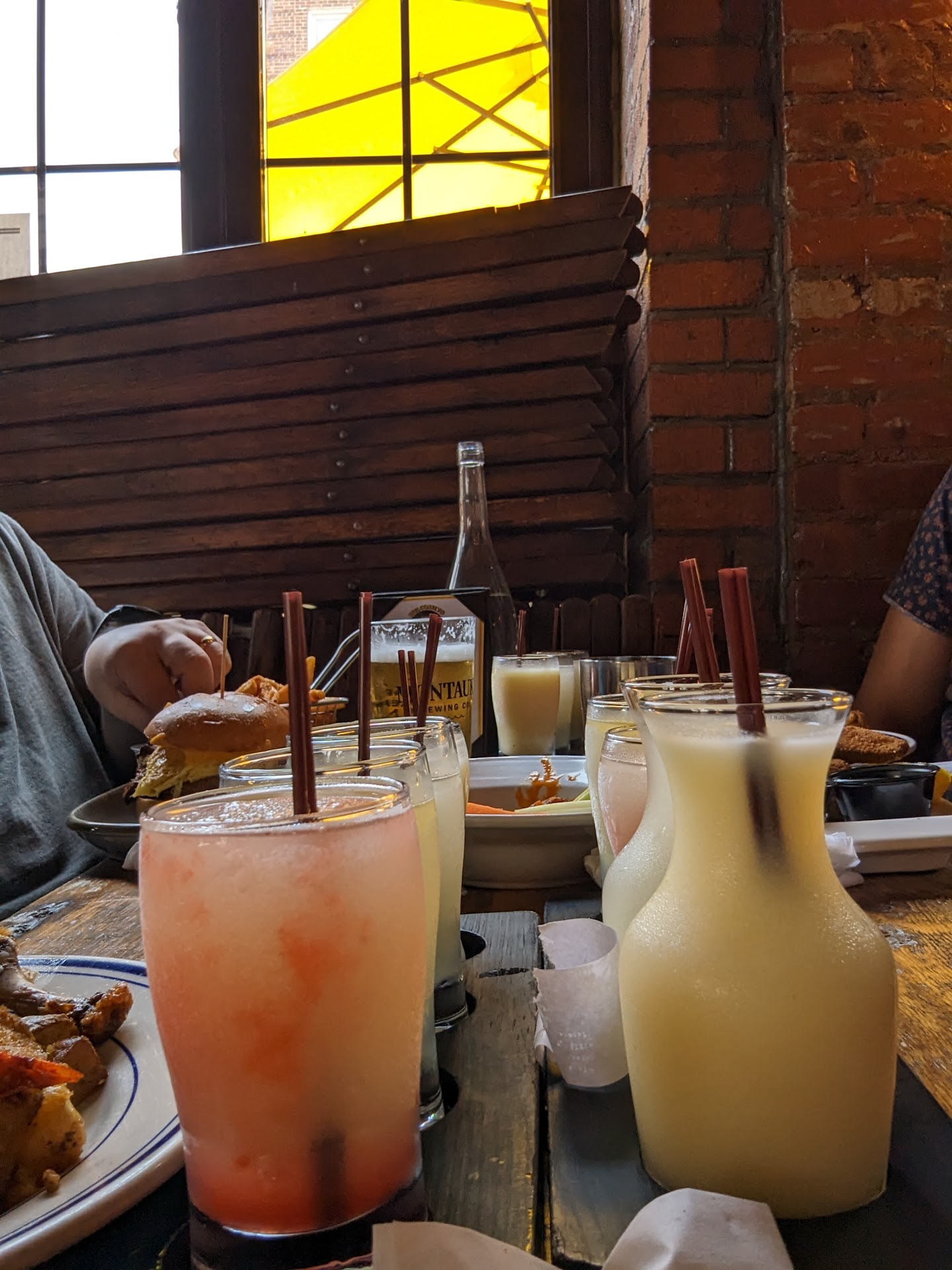 Read moreWe went here on a Sunday around 1:00. No reservation. We waited about 30 minutes and the hostess let us know that she had a table. However, it was right in front of the band that was about to perform and it might be loud. The alternative was waiting another 40 minutes, so we took it. Mistake, the amps are way too loud for the space. We tried to make it work but I couldn't hear my husband and he was right next to me. After 20 mins no waiter even came over but the hostess did come over to let us know another table opened up if we wanted to move, so we did. After 10 minutes our waitress finally came over and since we waited so long we knew what we wanted from drinks,appetizers to mains,so we ordered everything at once. Unfortunately and unwisely everything came at once. Three appetizers and three mains all came to the table at the exact same time. When one of my friends orders was wrong, the waitress was very argumentative. He ordered chicken and biscuits and he got chicken and waffles. It was so loud in there that it would make sense that she miss heard, but this seemed to stress her out and the service fell off from there. When she came out to bring the drinks there was no space on the table. We ordered three frozen flights and a beer, She just handed it to us and left the beer on the edge of the table leaving us to rearrange. We got the vibe that they wanted us to leave, another waitress came to clear our plates. But my friend was visibly still eating and she just stood there staring at him until he rushed his last bite and gave her the plate. While the food was good, the service was terrible, There was also an automatic 18% gratuity which was laughable based on the service. The band was good, but far too loud for the time of day. if you're looking to have a conversation at brunch I would not recommend this place. Even the hostess had to go outside to phone calls. This was a one and done spot, which is a shame because the food was good . We walked up the street to Cobblestone, better vibes and...