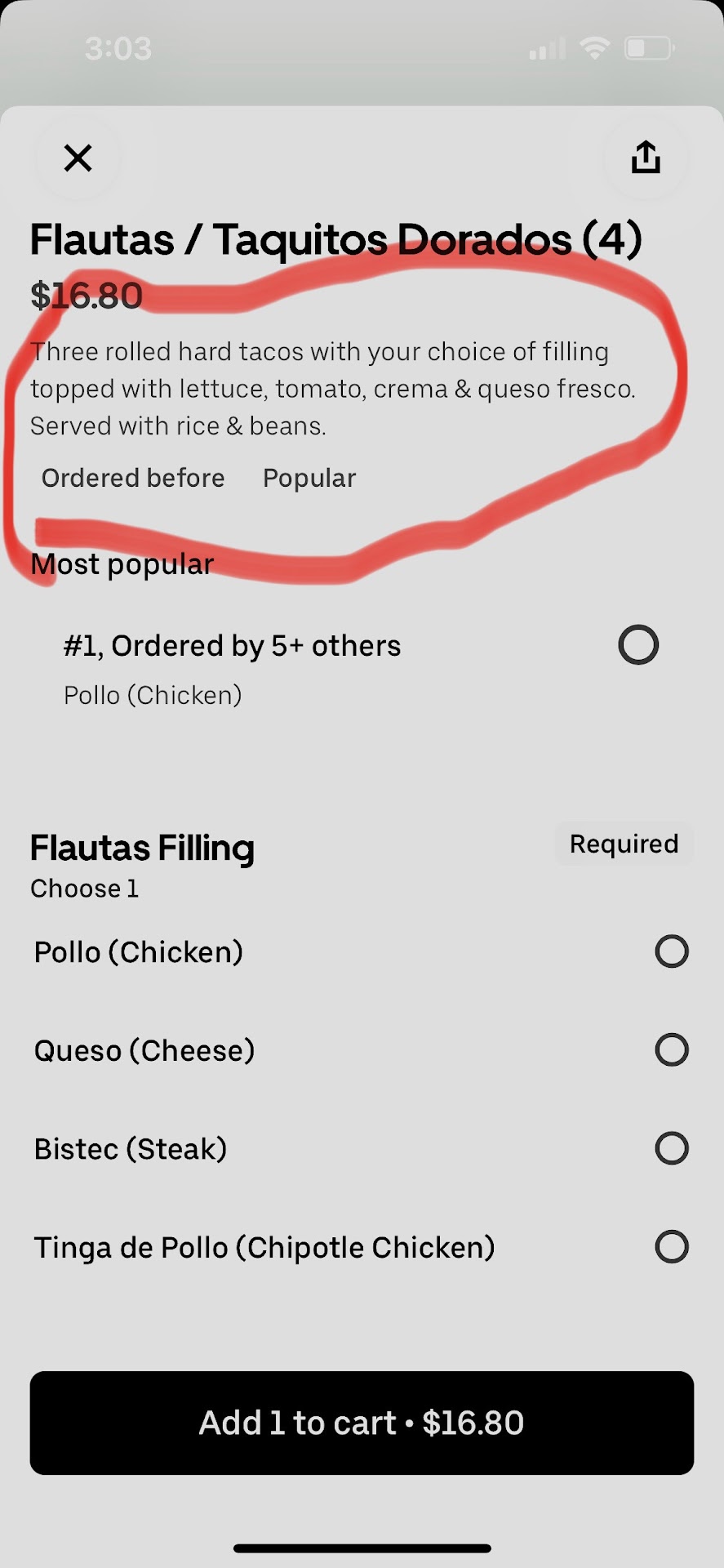 Read moreI feel bad that I got upset because I ordered something that specified three flautas served with rice and beans. They seem very nice but I was just disappointed that I paid almost 30 dollars since I ordered avocados on the side on uber eats and never received rice and beans. On the order it mentioned three flautas served with rice and beans, i believe they need to remove that because it doesn’t specify clearly that it’s 4 instead of 3. It states three like it comes with three flautas and...