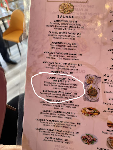 Read moreOne part of the meal (a sandwich) arrived approximately 1 1/2 hours after ordering. After ten more minutes passed beyond that delivery, we canceled the other parts of the order (a salad and vegetable side). They refused to cancel them and brought them out after we said we would not pay for them, as we had to leave and it had taken an unconscionable amount of time to deliver, even after we canceled. They refused to take anything other than full payment. The salad that was ordered also was missing key ingredients (as mentioned on the menu; see attached images), and the owner refused to look at the menu to even make the comparison. One drink we had ordered was a Mojito and that came about 80 percent mint. They have no tap water. The toilet had no toilet paper. If this works for you, enjoy. It's not an experience I would...