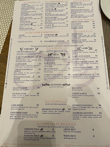 About food- we ordered 5 entrees, two appetizers and a side. To my utter dismay and my family’s (we are regular Persian eaters and we try and look for the best Everytime we travel) the food though looked pretty on the plate was terribly lacking flavor, aroma or any Persian taste. The rice was ok-ish with baghali pulav having not enough Lima beans and zereshk pulao appeared to be watered down version. The lamb koobideh was meh and chicken koobideh was ok but uncooked in some parts of it. The Cornish chicken (jooheh kebab) lacked any flavor and appeared chicken roasted with a dash of color with no marination. The only partly saving grace was mast moosir and the Qaimeh. White rice was just steamed basmati and not done persian style that fluffs up. In all the food was a major disappointment as we started our NYC trip with this meal. It’s the least best $200 spent on persian food for a family of 4 adults and two kids. I would definitely give this a pass and not recommend to anyone at all. PS: bartender/manager you may want to learn the art of management and know even good food cannot save...