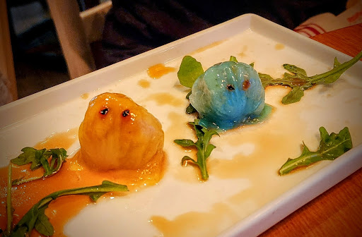 We started with the Pac Man Shrimp Dumplings. It consists of 4 "Ghosts" har-gow dumplings with a hint of lobster in the first (Red-Blinky), mushrooms in the second (Yellow-Clyde), crab in the third (Blue-Inky), and bamboo shoots in the fourth (Pink-Pinky). It came with a lightly battered fried sweet potato Pac Man disc seated on guacamole. While adorable and cutest presentation, it is something you get once. It was pretty boring and my least favorite dish. None of the specialty "flavors" came through and all four taste the same.