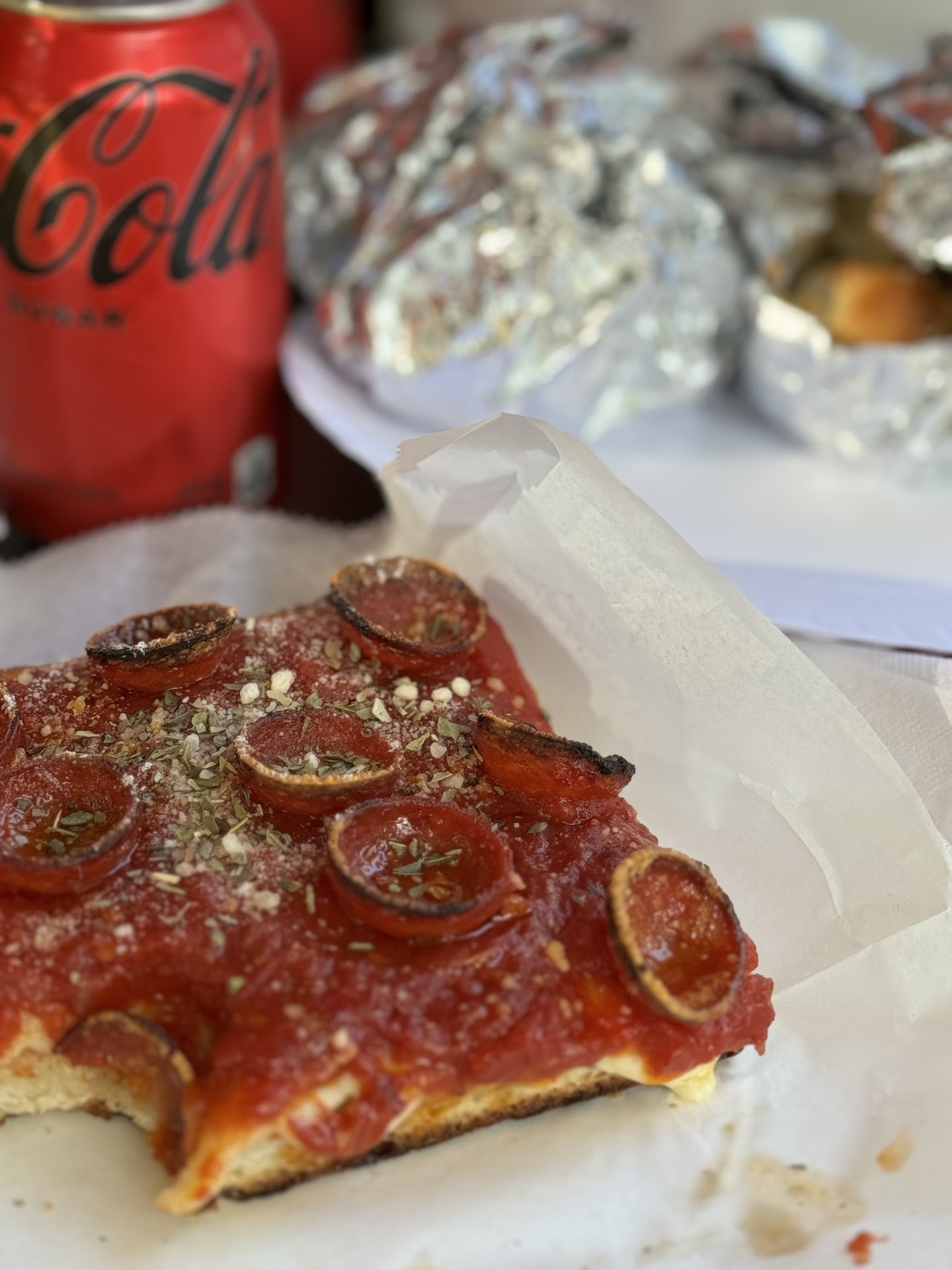 Second, the pizza quality. I had a personal criteria going into my pizza exploration and I really wanted to find a slice that has: crisp, good sauce, and good cohesion. The regular cheese slice really hit all marks for me, but I was in store for more. All the different slice varieties have unique sauces which kept things interesting in a great way. The Pep Diavolo was super flavorful and is probably my favorite, followed by the Upside Down, and Margherita. For the latter, the fresh basil came through in a way that I do not recall tasting for other Margherita slices.