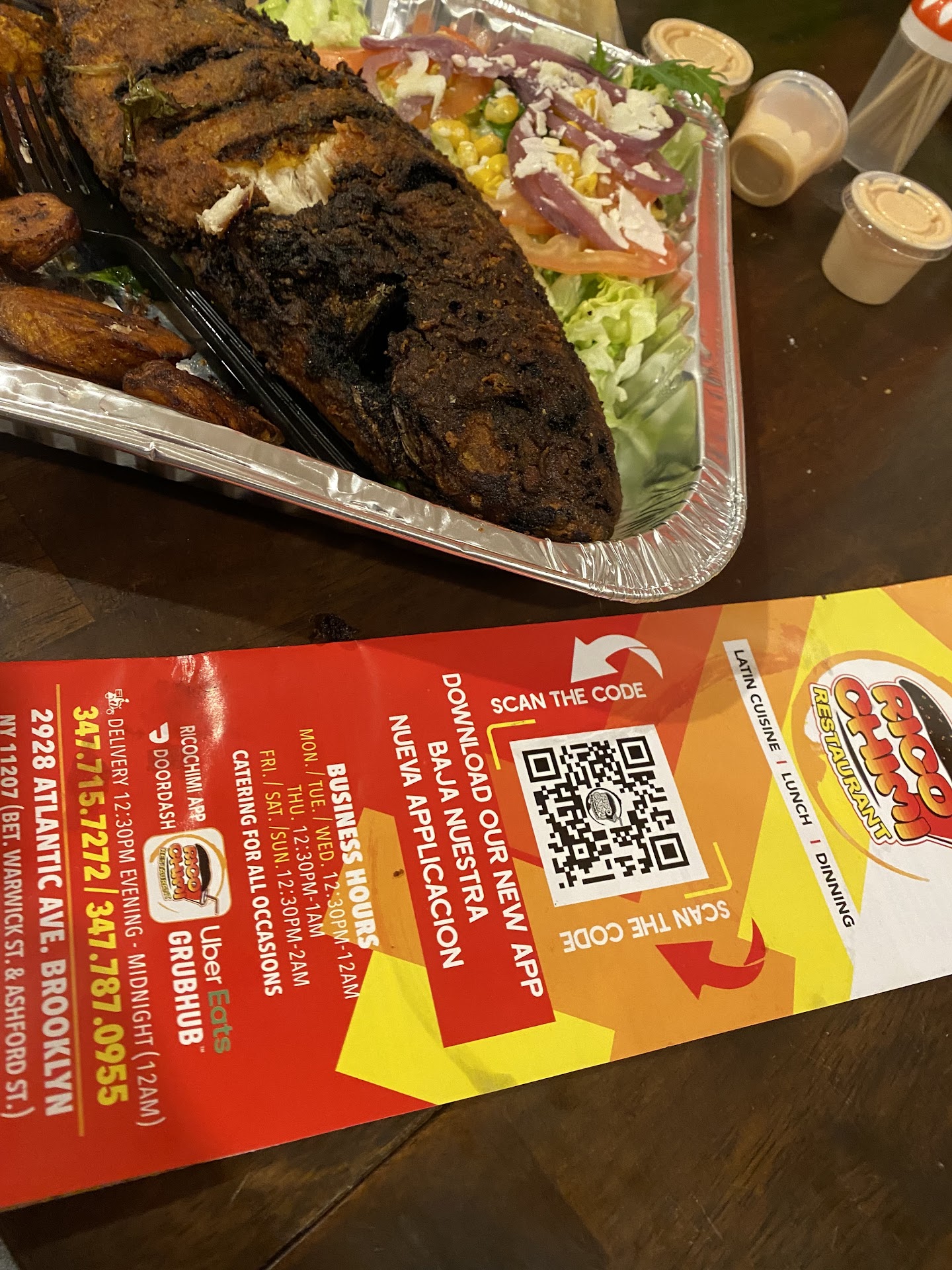 NO BUENOOOOOO…This place should be the definition of rip off. I’m not sure if they’re frying fish in the back of a pick up truck but I’ve had better fish from poor people in the villages. My fish was beyond burned. It was so burned and small I wasn’t sure if it was DIQUE FRESH RED SNAPPER. I should’ve done a DNA test the fish was so beyond recognition. Beyond charred. Past blackened. Being a sous chef in Manhattan myself, I would never nor would my chef allow this order to pass. Have you heard of a re-fire. I ask myself who expedited this order? Who continued to pack this order to be picked up ? Is my money not good enough? A address is provided what if patron complain in front of other patrons? Horrible horrible . This does not represent true Spanish culture or even any culture due to the level of burned . I’m still awaiting for a response via Uber Eats from the restaurant. This is a BRING YOUR OWN FISH . onions on my salad was OLD. Sweet plantain we’re not sweet probably fried with the same oil as the fish. Hard . Burned on the outside and hard on the side . I’m not sure is this order was made by a one handed prison beta fish because everyone on the line should get fired or replace by ME. It’s one thing when minorities complain about the community being gentrified BUT when my own minority community rips me off then what does that say about yourself?? I was better off eating at my workplace and spending more money AT LEAST THE CHEF WILL MAKE SURE MY FISH IS WORTH THE TAB!!! THE WORST FISH EVER AND IVE EATEN...