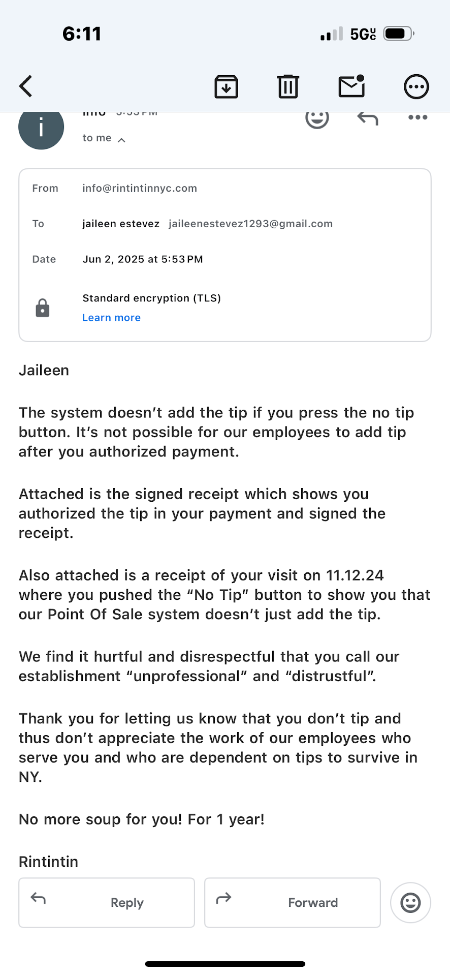 I am writing this review in the hopes that the people from Rintintin realize that this is not okay, and that it could hurt their business, which would be very sad. Hopefully you'll do better. For now I won't be returning anytime soon to a place I used to...