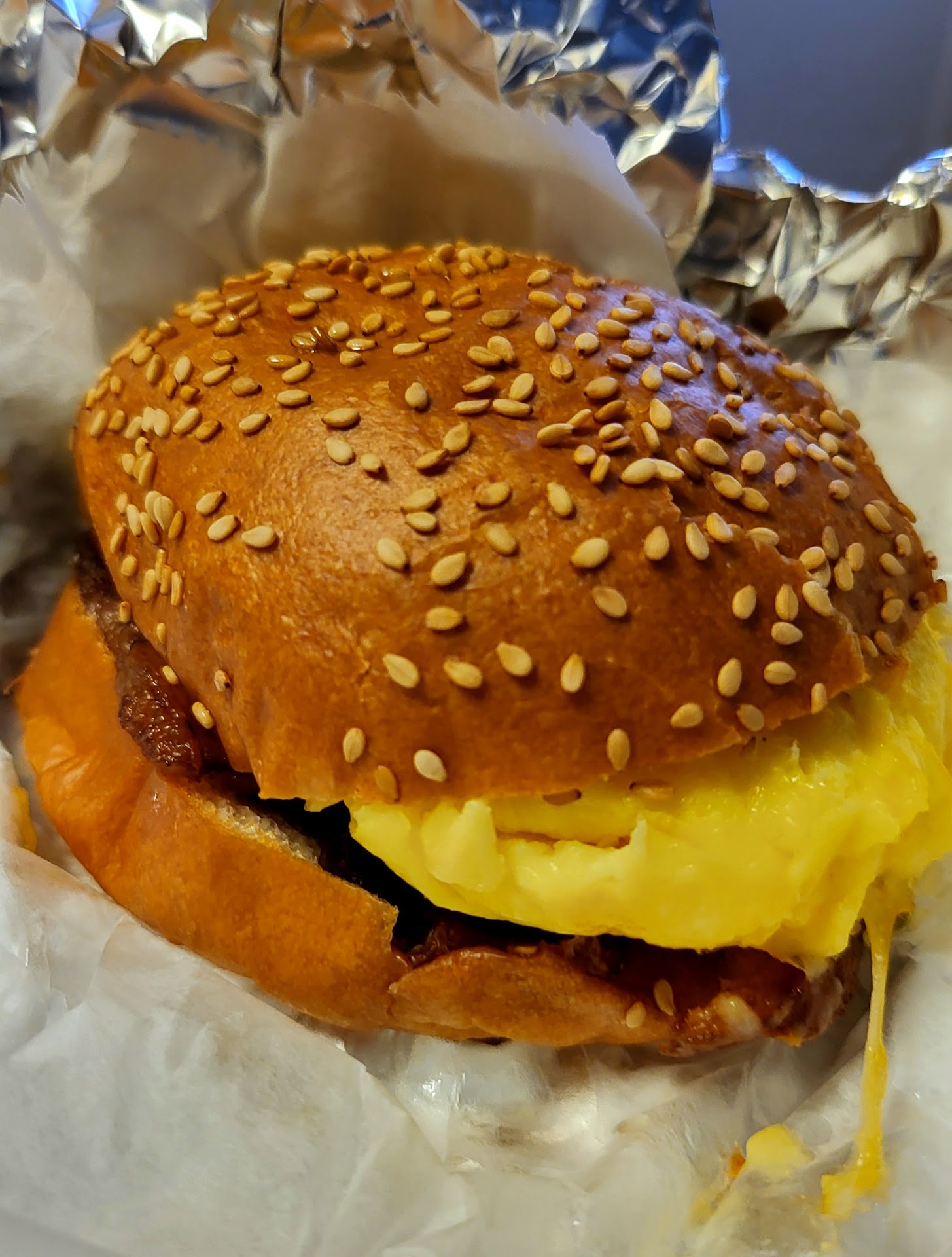 The egg and cheese sandwich on a brioche bun is tasty. My sandwich was hot, cheesy, and coupled with the best fluffy eggs. The chai latte had great flavor too.