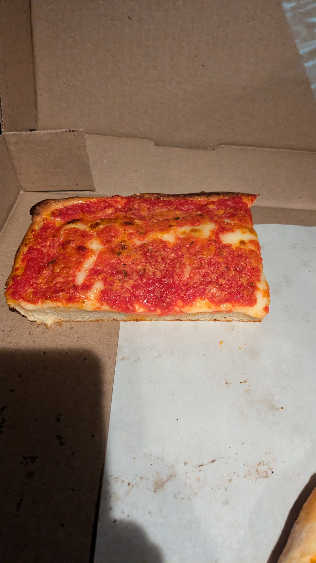 the pizza is very good. classic New York slice served hot— cheesy is a melty gooey blanket atop a layer of balanced tomato sauce on a foldable crust that isn’t too thin or too thick. the flavors and texture fit together nicely and make for a satisfying slice whether it’s lunch or late night. plain cheese slice, $3 + tax + tip.