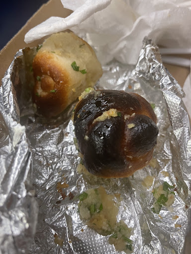 The garlic knots were so oversaturated with spicy garlic, and they DESPERATELY needed some salt, cheese, just anything to balance out the completely overwhelming amount of spicy raw garlic. Some of them were burnt as well, to the point I couldnât chew through them. Couldnât finish these either.
