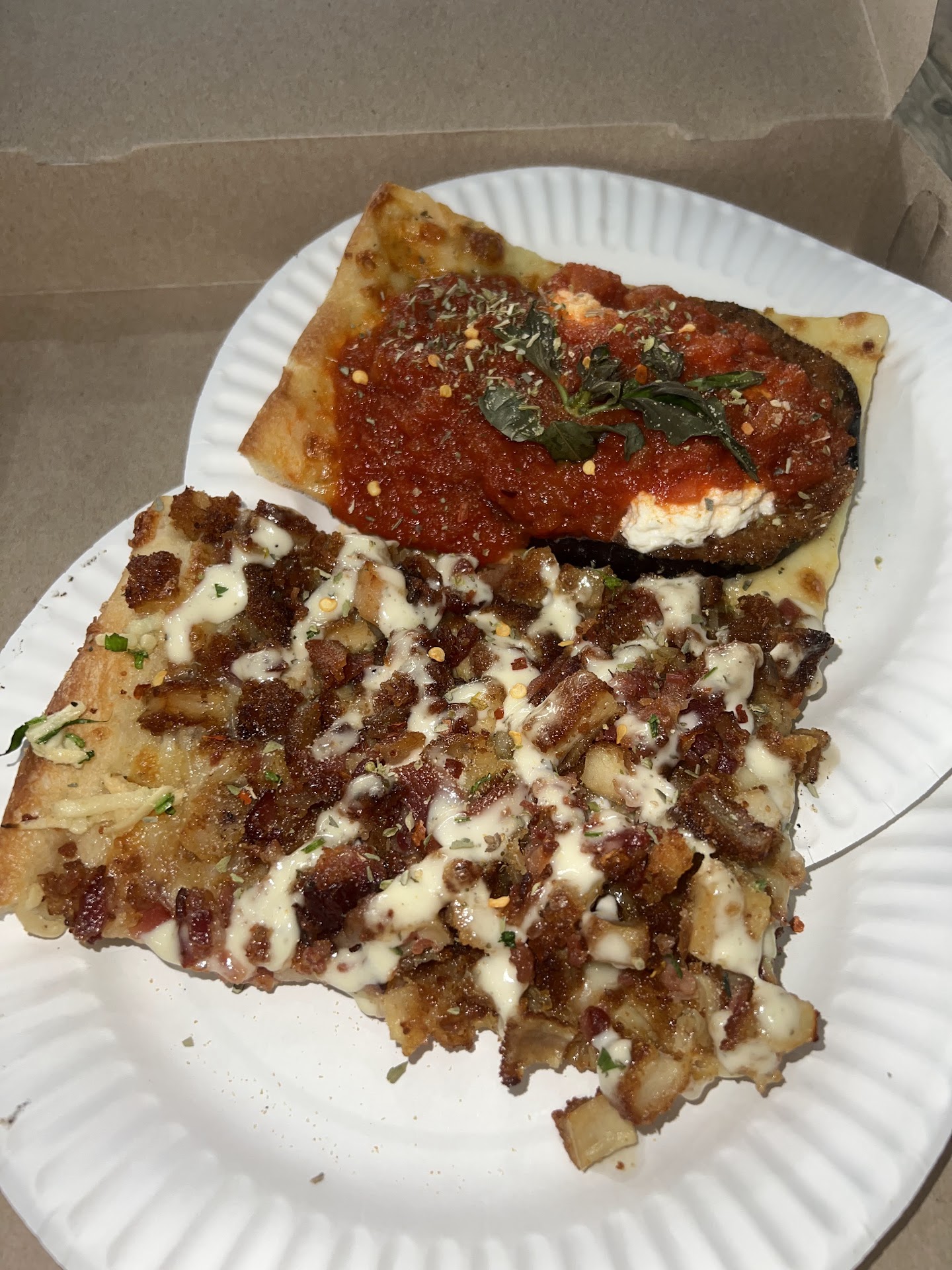 I've been craving pizza (happens a lot) and decided to treat myself to some since I had to go into the office. I found Rosella's through the Seated app and saw they have some interesting specialty pizzas, and I do love me a good specialty slice. I ordered for pick up via some site called All Set (as re-directed from Seated). The quoted time was about a half an hour (even for two slices), which I thought was a bit long because typically, the pies are already pre-made, and they just reheat the slice for you. I arrived 10 minutes early but my order was already sitting there (also, nobody greeted me by the way - I had to ask about my order). Both slices were cold - even though I ate it there, so that was kind of annoying. I had the chicken bacon ranch slice and Grandma's eggplant slice. Both were square slices, which was a nice change from the round pies. I usually LOVE CBR but this one didn't do it for me. I think it was the bacon - it was too smoky. Now the eggplant slice isn't something I'd normally order but all the reviews told me that I should and I'm really glad I did. Again, although it was cold, it was still really good. There is a whole piece of eggplant parm on there, complete with ricotta. The sauce was perfect. It had a nice sweetness to it but not overly so. I do like that they jampack ingredients onto the pizza. At least they're not skimpy with that. I was already full after the eggplant slice, so I probably didn't even need to order the CBR.