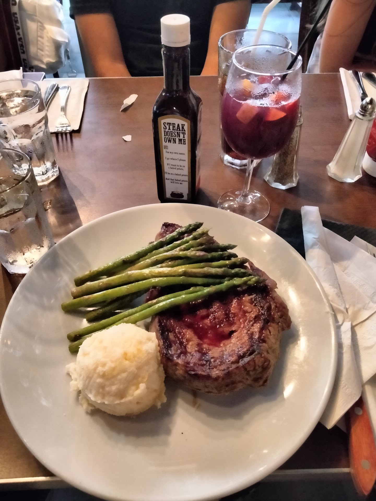 Upon our arrival, we were seated quickly and our server greeted us with pleasant smile and proceeded to take our orders. Since it was my last night in NYC I wanted my last meal to be extraordinary appetizing so I ordered the 16oz steak(medium rear) with mash and asparagus, my sister had steak also (medium well) and both my kid's had burgers. Our friend returned from the washroom and ask for some time to look over the menu but was told she all the orders needed to go in at once, that's correct but our server could have walked away for 5min but she wasn't given the chance to flip through the menu and ordered chicken.