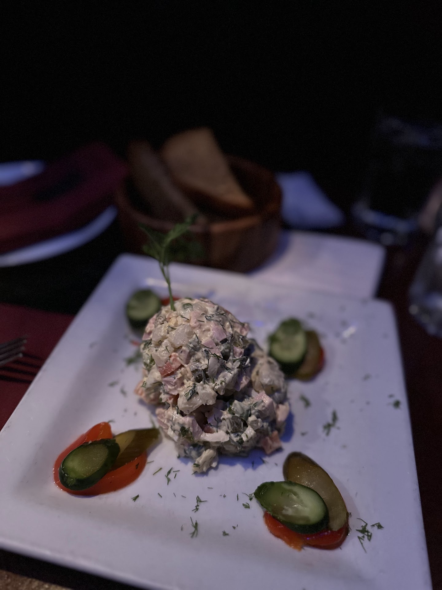 App Olivie Potato Salad Ordered this because they donāt have shuba that day(what a shame!) but to my surprise the salad wasnāt as greasy as I expected. There is nice ratio of mayo to potato, carrots, ham, egg, and with quite decent amount of pickled veg and dills. The overall taste is creamy but still kinda refreshing. I pleasantly enjoyed with the bread they offered.