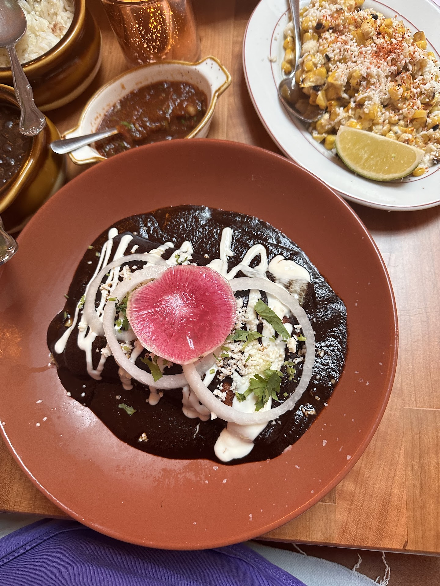 The food, however, is bad. It is not authentic. Nothing about it tastes authentically Mexican and especially not Oaxaqueñen. The veggie enchilladas were $25 for THREE measley enchilladas stuffed with nothing but corn. Like put some mushrooms and onions in there or something.