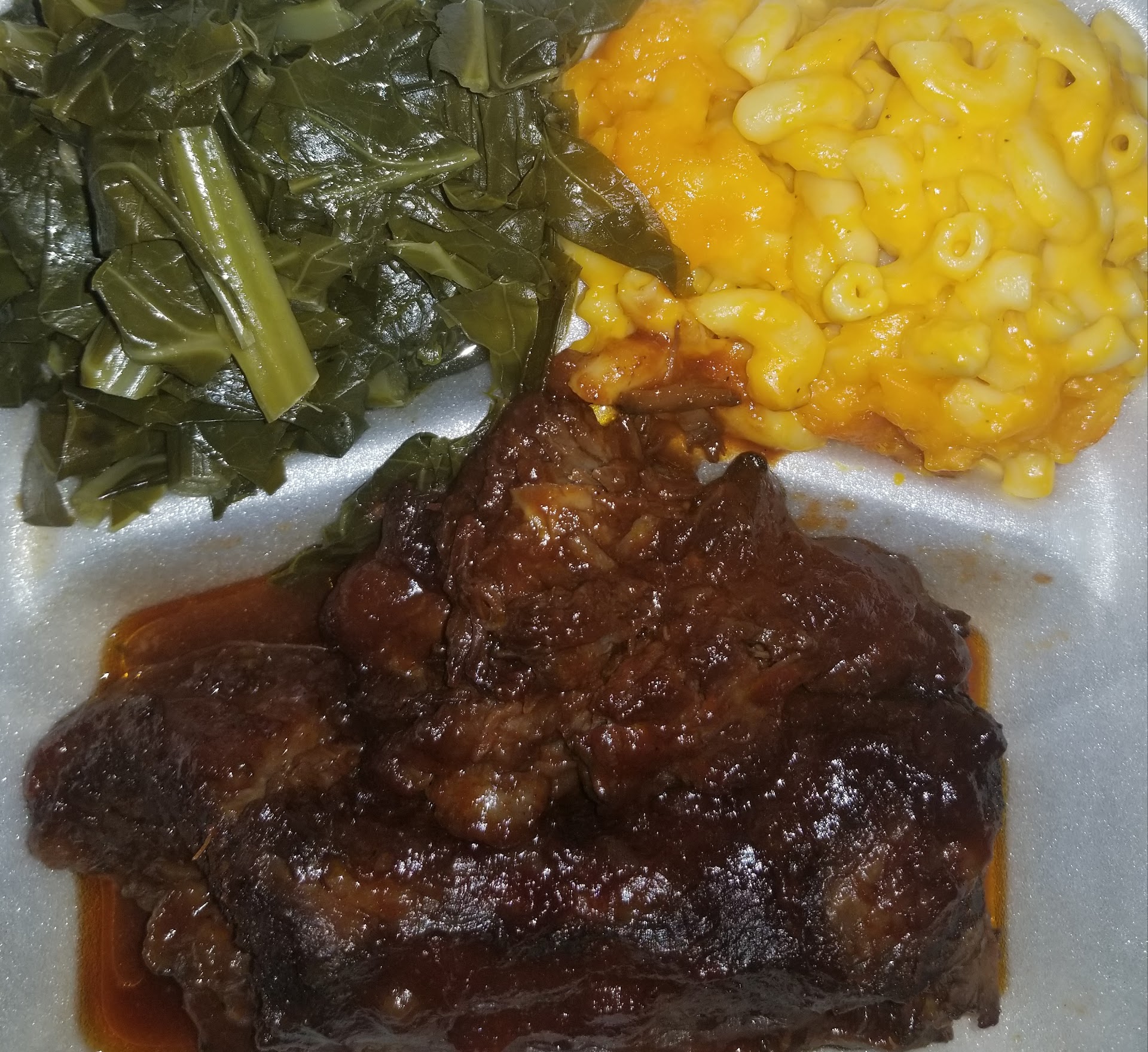 Read moreI have tried this restaurant a few times and compared to other soul food restaurants that I have tried I'd have to say that it's just OK. I have visited the store as well as ordered take out. The delivery service was incredibly slow and I had to reheat everything by the time it got to me. If I ordered from this restaurant again I would definitely walk in and pick up the order myself. The restaurant itself is small and not a sit down restaurant at all but if you chose to eat there the available seating can only accommodate about 2 people. So far I have tried their short ribs, fried seafood combo, sweet potato pie as well as their iced tea. The short ribs dish was severed generously and probably the best dish that I have had at this restaurant. It wasn't overly seasoned and cooked well. I had string bean and baked macaroni with my short ribs. I ordered this meal via the yelp app and had ordered collard greens originally but about 45 minutes later they called saying they ran out so I ordered string beans instead. So I never got the chance to taste their collard greens but the string beans were good. With that order I also tried there iced tea which tasted like it had 5 pounds of sugar in the one cup! No joke - I used their one serving to make a pitcher of normal tasting iced tea. That iced tea should definitely have a warning label for diabetics - seriously! On another occasion I walked in to order the fried seafood combo using a groupon I purchased. The meal I must say was very salty for my taste. It tasted as if they used a boxed fish fry mixture instead of their own and just added salt. Not sure if I will return to this restaurant again in the future but I wouldn't order the...