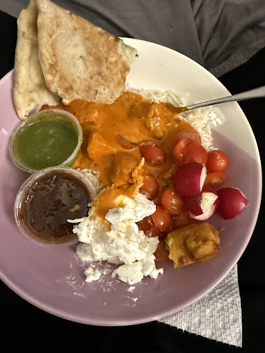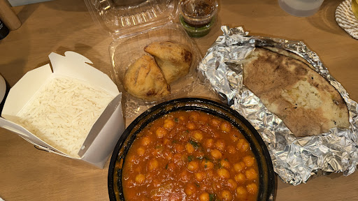 I’m vegan and got the Chana Masala which was full of flavor!! The vegetable samosas here are vegan and came with two delicious sauces a green mint and tamarind. The tandoori roti (also vegan friendly) was chewy and handmade, quite possibly the best I’ve had. The long grain rice that comes with the entree had a subtle, delicate flavor (maybe Saffron cooked in) soo fluffy and complimented the curry well!
