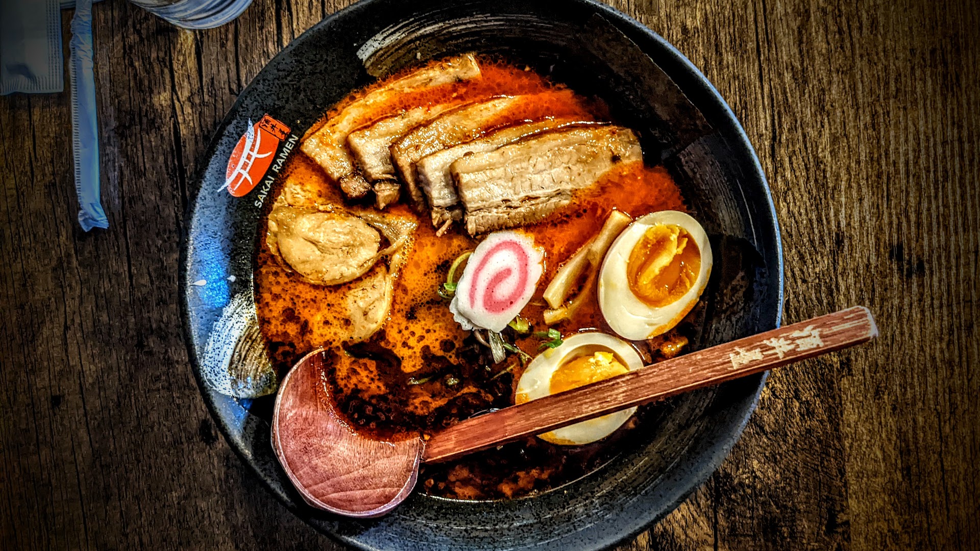 Sakai Ramen, Staten Island, NY These folks have a giant E Honda on the wall overlooking the dining area so you know they mean business. This spicy Sakai Ramen bowl was really, really, enjoyable. The broth was thin and delicious, not overly salty as some places tend to be. I could drink a whole bowl by itself, f'real. I asked for extra spice and it wasn't really very spicy by my standards. It was tolerable by a lot of people who probably don't do spicy. I will say though, that during my bowl about halfway through, I ended up having some go into my airway and I had to chew super fast, put my utensils down, and swallow before I coughed my mouthful out all over the table. It caught me off guard. For the next 3 minutes I was fighting back more coughs, sniffles, and watery eyes. So embarrassing. But man, this is what it feels like to be alive. The bowl came with chicken chashu and pork chashu standard but I asked for more pork chashu and I'm very, very glad I did. The meat in this bowl was very soft and delicious and had its own unique flavor. Like the broth, it wasn't too overpowering or salty so I could really get into it and eat a lot without feeling like a dirtbag. I'm usually not a fan of thin noodles, but in this bowl with everything else meeting my expectations and tasting delicious I didn't even care. The noodles soaked up the broth just fine and complemented the bowl nicely. Everything else there; bamboo, seaweed, and corn, was a nice touch. Overall, I'd say this is probably my favorite Ramen Shop on Staten Island now. I don't think there's a whole lot of them out here but I bet it would be hard to find one much better. A+...