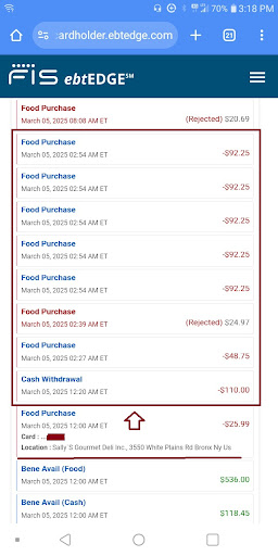 Attached is a screenshot of my uncle's stolen EBT deposit. You'll notice that 20 minutes after his purchase from Sally's Gourmet Deli his money and food stamps were stolen in patterns. You'll notice at the top, the $20.69 that was rejected at the supermarket at 8:08am was when my uncle realized his funds...