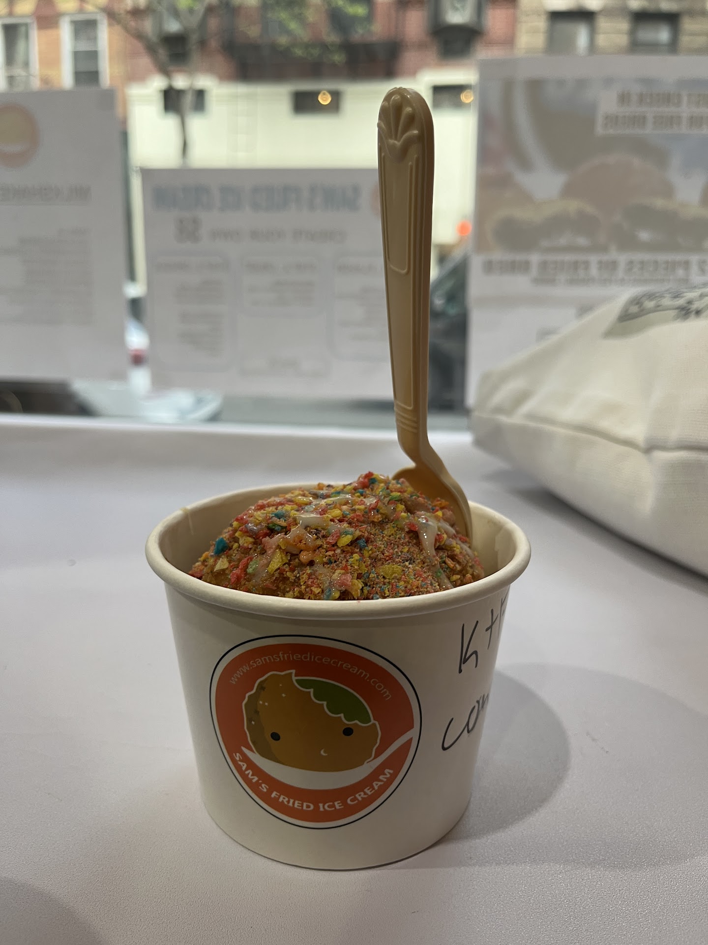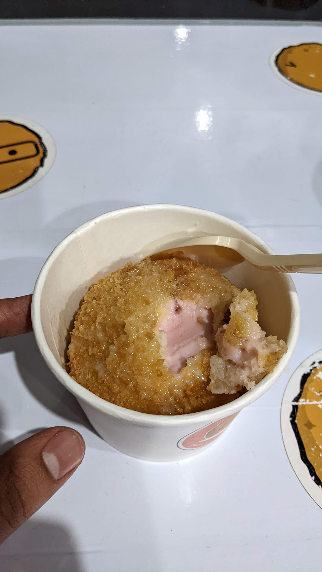I ordered the cookies and cream with fruity pebbles and condensed milk. Seeing the drizzle of condensed milk they gave me I just had to laugh at how little they put on. But the breading is delicious and adds a nice flavor and texture with the ice cream. The ice cream stays cold even though it’s fried.