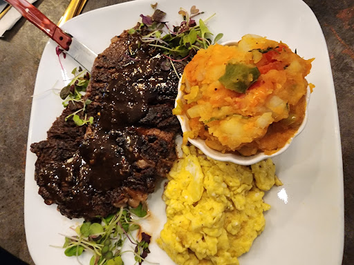 Read moreFirst off this is what great food looks and tastes like, the atmosphere is perfect for those who love Caribbean cuisine and music while they dine. The vibes remind me of a Sugar Cane in it's hay day. I'm half Trini and half Grenadian so I definitely feel at home when I come here. Every time I come back to Brooklyn this establishment is a must. The recipes remind me your mom and grandma style cooking (major comfort food) but with a new age flair, and the drinks are all tasty, both alcoholic and non-alcoholic. My favorite on the menu are Dem Boys Wings, beautifully seasoned chicken fried to perfection with a sweet glaze sauce and passion fruit dipping sauce on the side. I need this recipe lol. The corn soup is Trini-style so it's the perfect consistency, the calaloo could have been a bit thicker (in my opinion). The chicken and waffles are a classic combo but as a Trini I'd appreciate more of the chadon beni flavor to shine through. The Skirt Steak and egg is paired with the best home fries I've had, as they're perfectly seasoned and the ox tail tacos along with the ox tail Mac and cheese had the beautifully braised ox tail meat minus the fatty pieces. The Mango Chow is the perfect compliment to start or end a meal in my opinion, I just added some of their homemade peppa sauce to give it that extra kick I like. I could rant about this place for hours and I will be back to try more of the menu in the future. This restaurant makes me excited for food again, as I feel a lot of the traditional Caribbean place in NYC food quality has gone down over time.