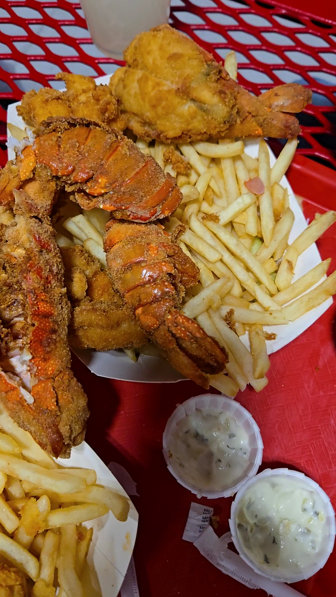 We tried a variety of dishes, including raw oysters, fried lobster tails, broiled lobster tails with garlic pasta, Manhattan clam chowder, a cheeseburger with fries, chicken tenders, and fried shrimp. Everything was flavorful and cooked to perfection, except for the garlic pasta, which was a bit bland. Despite that, the quality of the other dishes made up for it.