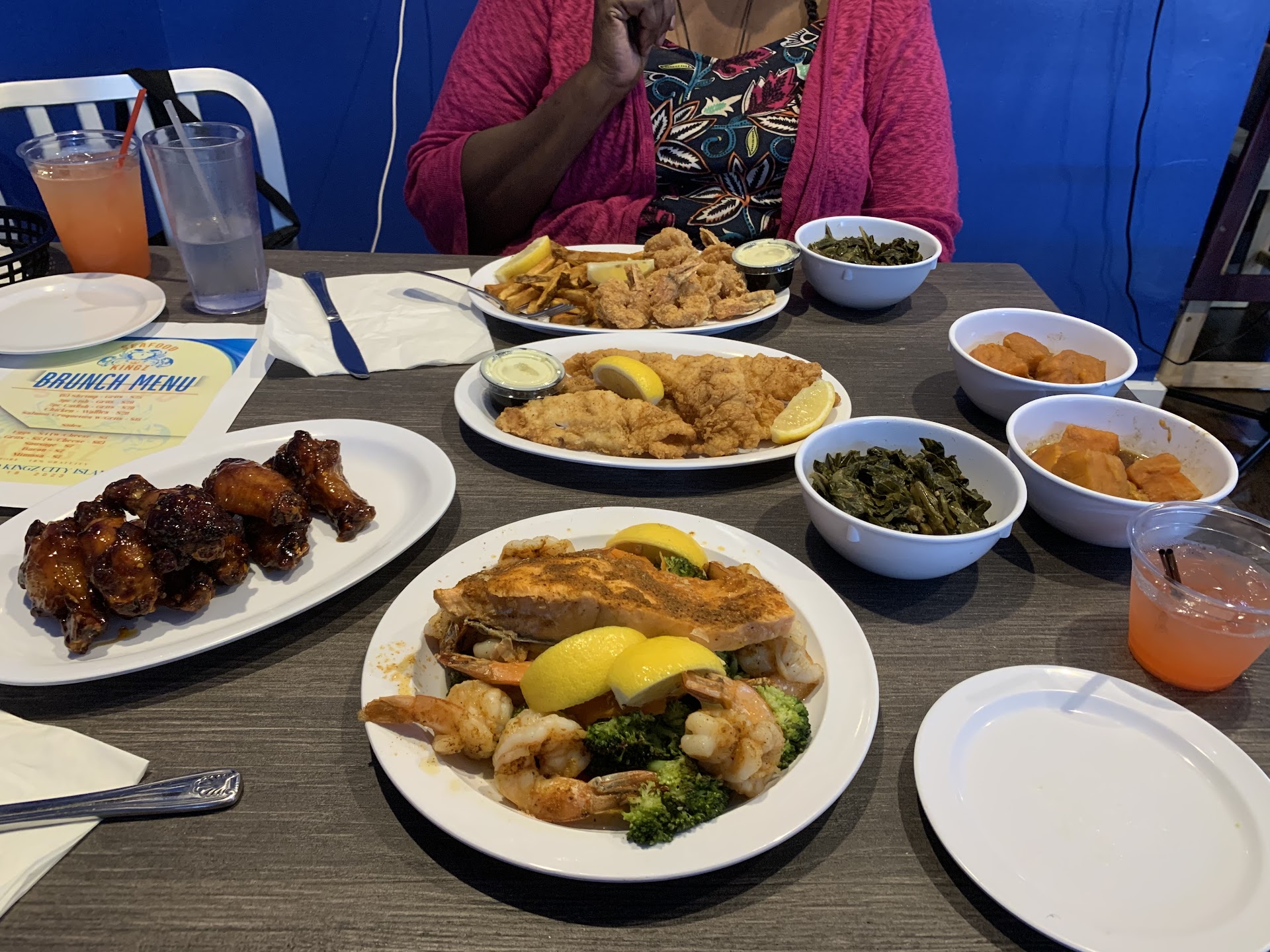 Read moreTried Seafood Kingz for the first time, and the entire experience was disappointing to say the least. We walked in at 12:48pm, and upon seating ourselves we noticed none of the 8 booths were served. The restaurant was understaffed and clearly overwhelmed, so we patiently waited to put our order in. First red flag was when the wait staff said he had to find out if they had water. We ordered everything at once (since we had more than enough time to figure it out). For an hour we watched as delivery after delivery left the restaurant. As we waited the entire dining area collectively spoke about the lack of attention from staff. We all were there to support small and black owned businesses, but were all frustrated. Our four plates did not come out together. My order did not come w the fries I asked for, and brought it to the owners attention. He said IF I wanted them it would be out in 3 minutes. I declined and respectfully said we had been waiting for over an hour and doubted the fries would be out that quickly. The owners response was that we needed to be patient and understanding, to which I took offense to because we all waited patiently and had not been rude in any way, but because I empathized, I let it go. THEN 20 minutes into eating, the wait staff brings out an order of dry chicken wings. The order was a basket of wings, catfish and shrimp and the wings came out 20 minutes after!? To make things worse, the owner never comes back out to speak with us, but instead sends out a different wait staff (this is the 3rd person we’re dealing with within a 2-hour window). The young man was apologetic and so sweet, but when we asked for the check he said he’d needed to take down our orders again and create the receipt. Very frustrating. About 30 minutes later and we’re still waiting for the check and our credit card. The wait staff verbally told us the amount and said he was charging the card. We never saw an itemized receipt or anything proper. They charged us $160 for food we waited 60+ minutes for. The side portions are small and everything in general is overpriced. When the owner finally took our card to be charged I explained that not once did he come out and ask us about our service, our food, or offer any gesture to his patient customers. Did I mention two tables walked out on them? They didn’t care at all. I give them a 1 star because the breading on their seafood was good. Everything else was mediocre soul food. Had the owner been more responsive, and catered to his diners as opposed to the delivery/ to-go, I’d give it a higher rating and even return. Good...