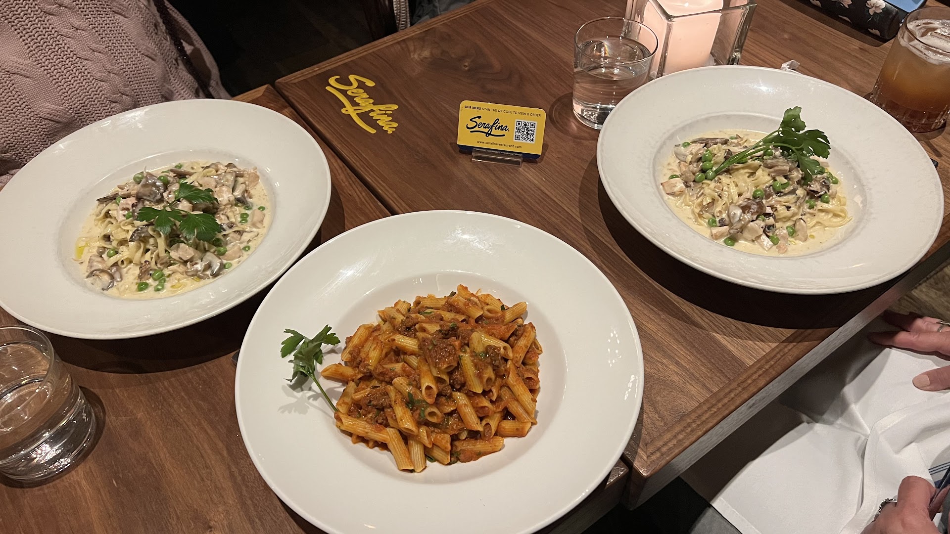 We started with the famous Serafina bruschetta, which was fresh and bursting with flavor. For the main course, I had the truffle pasta, and it was hands down one of the best pasta dishes I've ever had. The pasta was perfectly al dente, and the truffle cream sauce was rich but not overwhelming. My friend had the margherita pizza, which was crispy on the outside, yet soft and chewy on the inside – just the right balance.